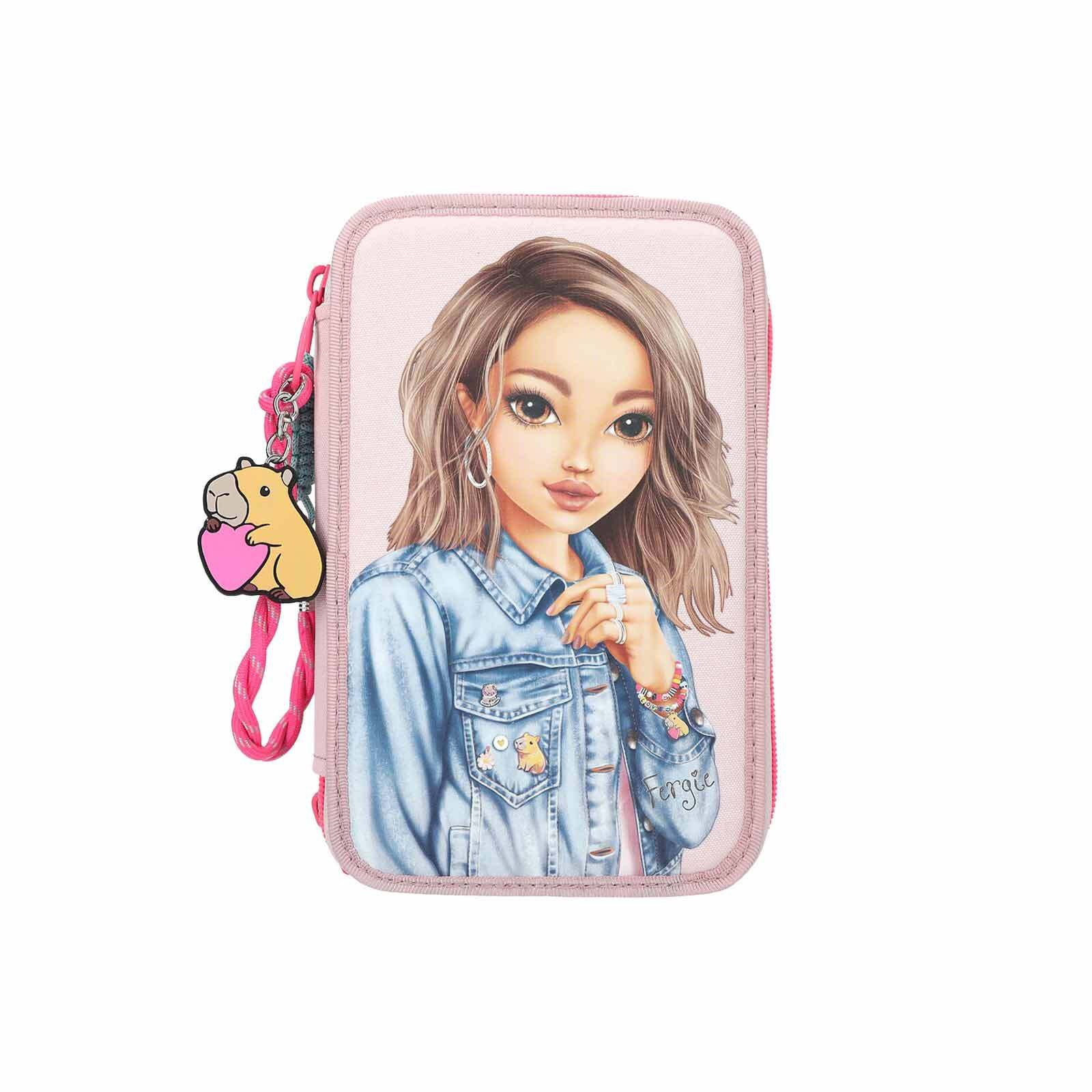 Jeans mit Rosa ist immer top! Die roséfarbene TOPModel-Federtasche mit pinken Reißverschlüssen hat auf der Front ein großes Model-Motiv mit lässiger Jeansjacke. Süßes Extra: der Capybara-Anhänger und die bunten Bänder am Reißverschlussanfasser. Die drei separaten Fächer sind komplett gefüllt mit je 18 Filz- und Buntstiften, 2 Bleistiften, Anspitzer, Radierer, Lineal, Schere, Klebestift und einem kleinen Klett-Täschchen. Hauptmaterial: 100 Prozent Polyester