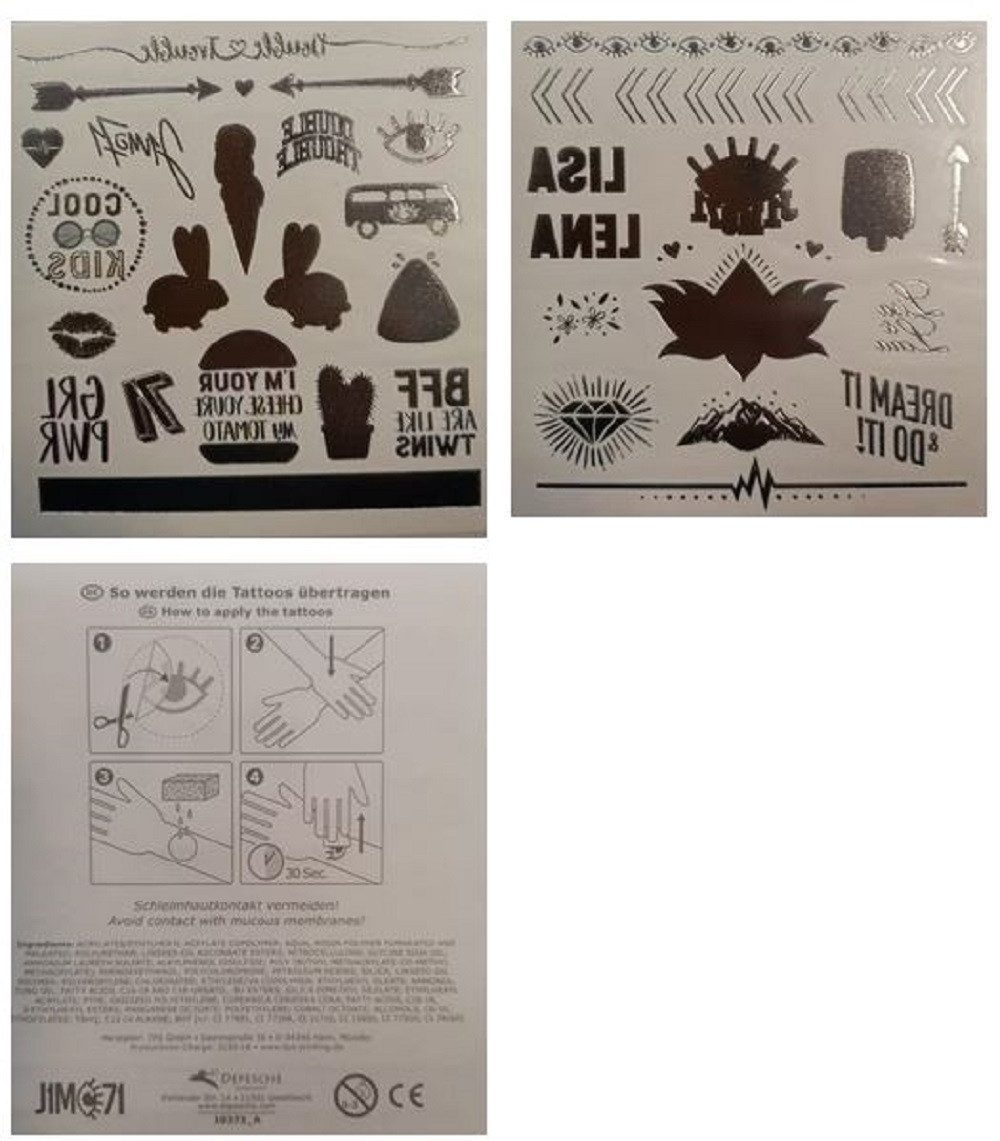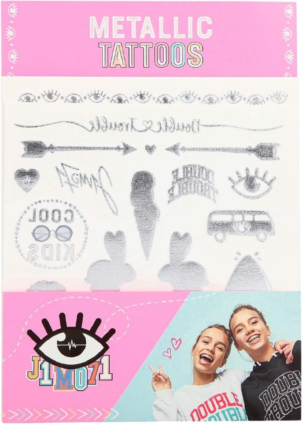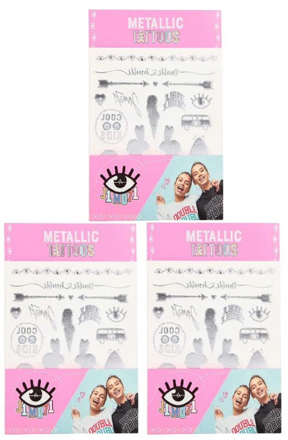 Die Tattoos mit Metallic-Look im trendigen J1MO71-Design sind das perfekte Accessoire für coole Outfits. Kleben Sie einfach eines der Tattoos mit einem feuchten Tuch auf die Haut. Das Set enthält zwei Bögen mit über 30 Tattoos in trendigen Designs. Träume es nicht – tu es! Das ist das Lebensmotto der Musical.ly-Stars Lisa und Lena. Danach leben sie – und dafür werden sie von allen geliebt: Mit dem Modelabel J1MO71 haben sich Lisa und Lena ihren Traum erfüllt – denn schon seit frühester Kindheit kreieren die Mädchen Mode. Zu diesem Zweck nutzten sie auch die Topmodel-Malbücher und steigerten ihr Interesse an Mode, Farben und Formen. In ihrer Modekollektion J1MO71 zeigen Lisa und Lena viel Persönlichkeit: Sportliche Looks mixen mit mädchenhaften Farben und coolen Logos. Ihr Spaß an Mode wird besonders durch die vielen trendigen Details geschätzt, die jedes Teil zu etwas Besonderem machen. Depesche 10373 - Tattoos mit Metallic Effekt, Lisa und Lena J1MO71 Tattoos mit Metallic-Effekt , Designt von den musica.ly Stars Lisa und Lena, passend zur J1MO71 Kollektion Trendige Motive , Enthalten sind 2 Bögen mit vielen coolen Tattoos ,Lassen sich einfach mit Wasser und Seife ablösen Sportive Looks mit mädchenhaften Farben und coole Logos, das ist der Style von Lisa & Lena, der in der J1MO71 Kollektion gezeigt wird. 2 Bogen mit coolen Tattoo Motiven zum Auftragen auf die Haut.