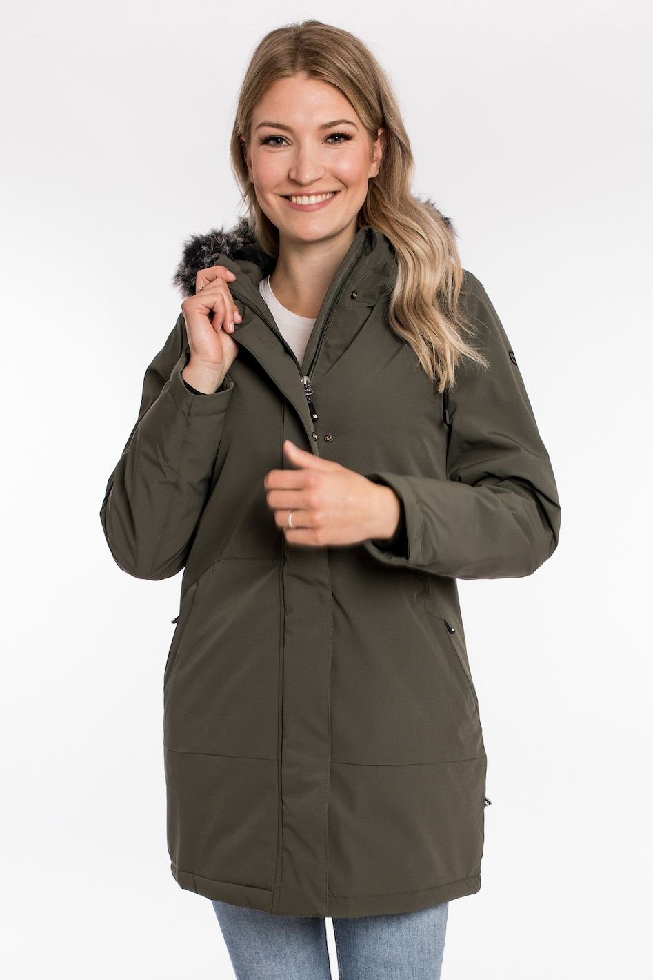 Wenn es draußen kalt und ungemütlich wird, dann bist du mit dem Parka BLACK DIAMOND von deproc active bestens gewappnet. Funktionalität und elegantes Design sind hier bravourös kombiniert. Das wasserabweisende Außenmaterial schützt vor Regen und Schnee. Eine TPU Membran sorgt dafür, dass Nässe bis zu einer Wassersäule von 3000 mm nicht in das Material eindringen kann. Der Elasthananteil des Außenmaterials sorgt für eine softe Haptik und ausreichend Bewegungsfreiheit. BLACK DIAMOND ist mit einem glatten Futter ausgestattet, sodass du mit allem, was du unter der Jacke trägst, ganz bequem hineingleiten kannst. Durch den langen, leicht taillierten Schnitt des Parkas bleiben auch Hüfte und Oberschenkel gut geschützt. Das cleane und minimalistische Erscheinungsbild der Langjacke wird durch den Kunstfellbesatz an der Kapuze unterstrichen. Dieser kann bei Bedarf ganz einfach mit einem Reißverschluss abgetrennt werden. Somit lässt sich der Parka auch ganz bequem für die Übergangszeit nutzen, ohne dabei nach Winter auszusehen. Die Ärmelabschlüsse sind mit soften Rippbündchen ausgestattet und sorgen dafür, dass Wind und Kälte nicht in die Jacke eindringen. Ein 2-Wege-Reißverschluss ist bei einem Parka unerlässlich und fehlt natürlich auch an BLACK DIAMOND nicht. 2 gemütliche und sehr geräumige Eingrifftaschen können mit einem Reißverschluss geschlossen werden. Außerdem verfügt die Jacke über 2 weitere Innentaschen.