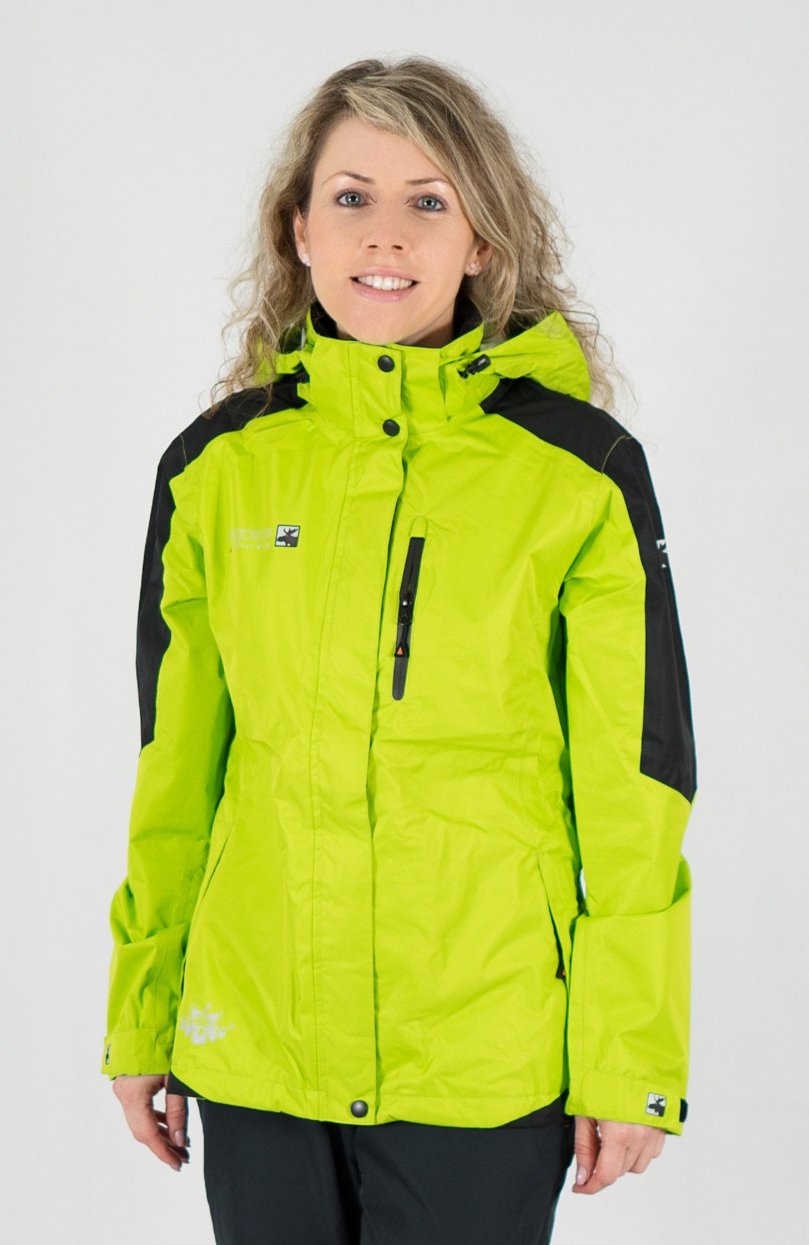 Mit der neuen Regenjacke und Outdoorjacke für Damen ESCA sind Sie bestens für Aktivitäten bei Wind und Wetter ausgerüstet. Denn das wind- und wasserdichte Material sowie die feminine Schnittführung sorgen für hohen Tragekomfort und beste Bewegungsfreiheit, besonders in großen Größen. Für modische Attraktivität sorgen kontrastierenden Ärmeldetails. Das funktionelle und detailreiche Design der Outdoor Jacke für sportlich aktive Frauen vereint sich mit den herausragenden Eigenschaften wie Schutz vor Witterungseinflüssen und hohe Atmungsaktivität. Damit auch der Hals gut geschützt ist, kann der Frontreißverschluss bis zum Kinn geschlossen werden. Zusätzlich steht eine abnehmbare, verstellbare Kapuze mit Hals- und Kinnschutz zur Verfügung, die den Komfort erhöht. Ebenso bieten die Ärmelbündchen mit Weitenverstellung mittels Klettverschlüssen, der elastische Kordelzug am Bund, getapte Nähte und die Unterarm-Ventilations-Reißverschlüsse besten Tragekomfort und Funktionalität, vor allem in schwierigem Gelände. In den zahlreichen Taschen können Sie wichtige Dinge für Ihren Ausflug unterbringen, sodass Sie diese unterwegs jederzeit zur Verfügung haben.