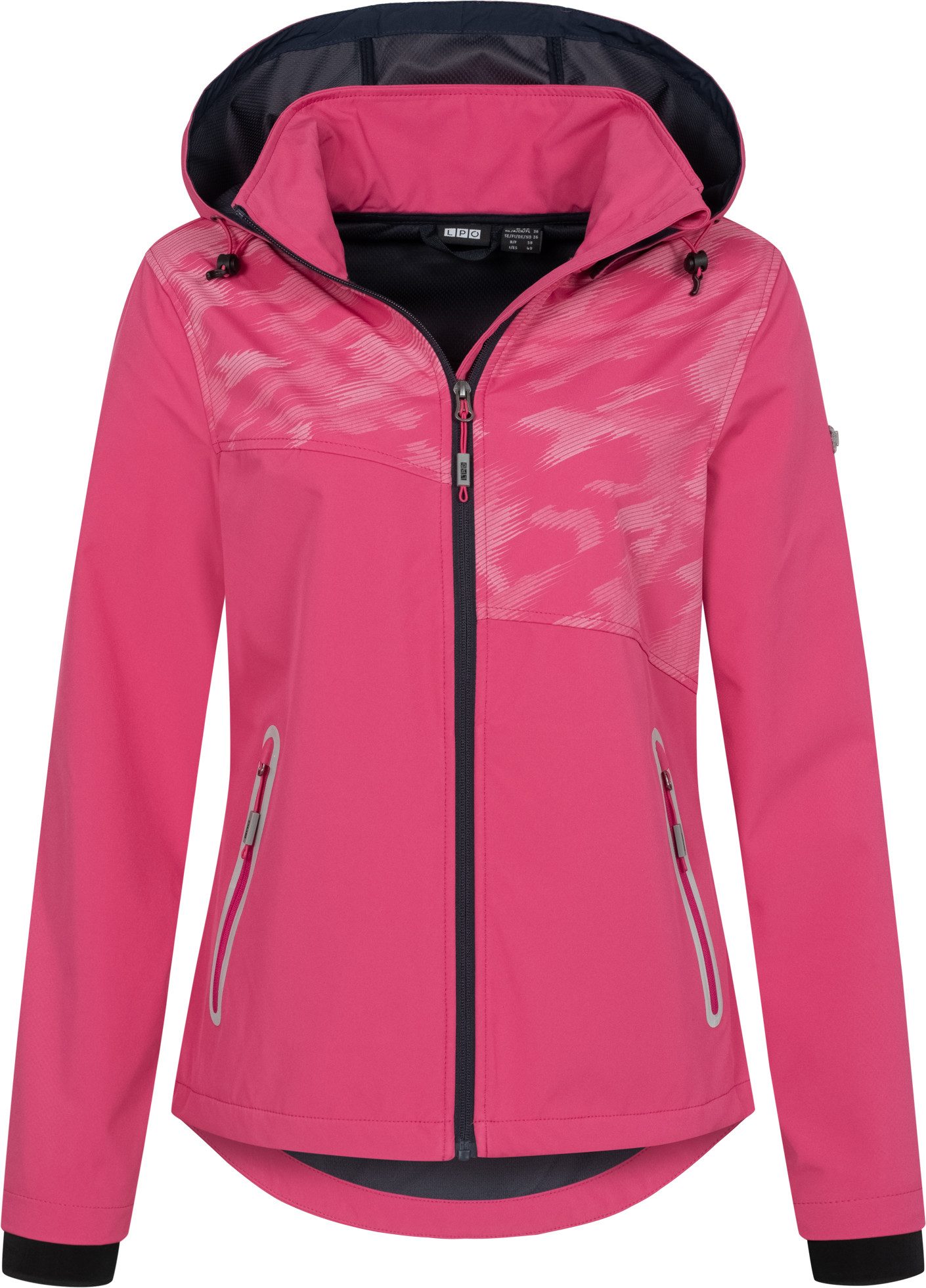 Damen Softshelljacke Patricia PATRICIA, hochfunktionelle Softshelljacke ist mit einer 3-Lagen-Membrantechnologie atmungsaktiv, wasser- und windabweisend. Das Material ist extrem wasserabweisend und verfügt über eine Wassersäule von 8.000 mm. Gleichzeitig ist die Übergangsjacke hoch atmungsaktiv, was wiederum ein geregeltes Körperklima gewährleistet. Das dünne Softshellmaterial wurde speziell für die Übergangszeit und kühle Sommertage konzipiert. Richtig kombiniert ist unsere Patrica Softshelljacke somit eine einsatzfreudige Ganzjahresjacke, die es auch im Winter als 3. Lage gern mit Wind und Kälte aufnimmt. Wird es richtig ungemütlich, sorgen der hohe Stehkragen sowie die abnehmbare Kapuze für besten Schutz. Seitliche Taschen sind mit Reißverschluss verschließbar und sind mit reflektierendem Druck eingerahmt. Der körpernahe Schnitt kann mit einem elastischen Kordelzug im Saum bequem reguliert und enger gemacht werden. Die Armabschlüsse haben einen innenliegenden Windfang. Wichtiges Fashion-Highlight ist ganz klar der reflektierende All-Over-Print Einsatz im Brustbereich der Jacke, der die Damenjacke zur Lieblingsjacke für jede Gelegenheit macht und zusätzlich bei Dunkelheit Sicherheit gibt.