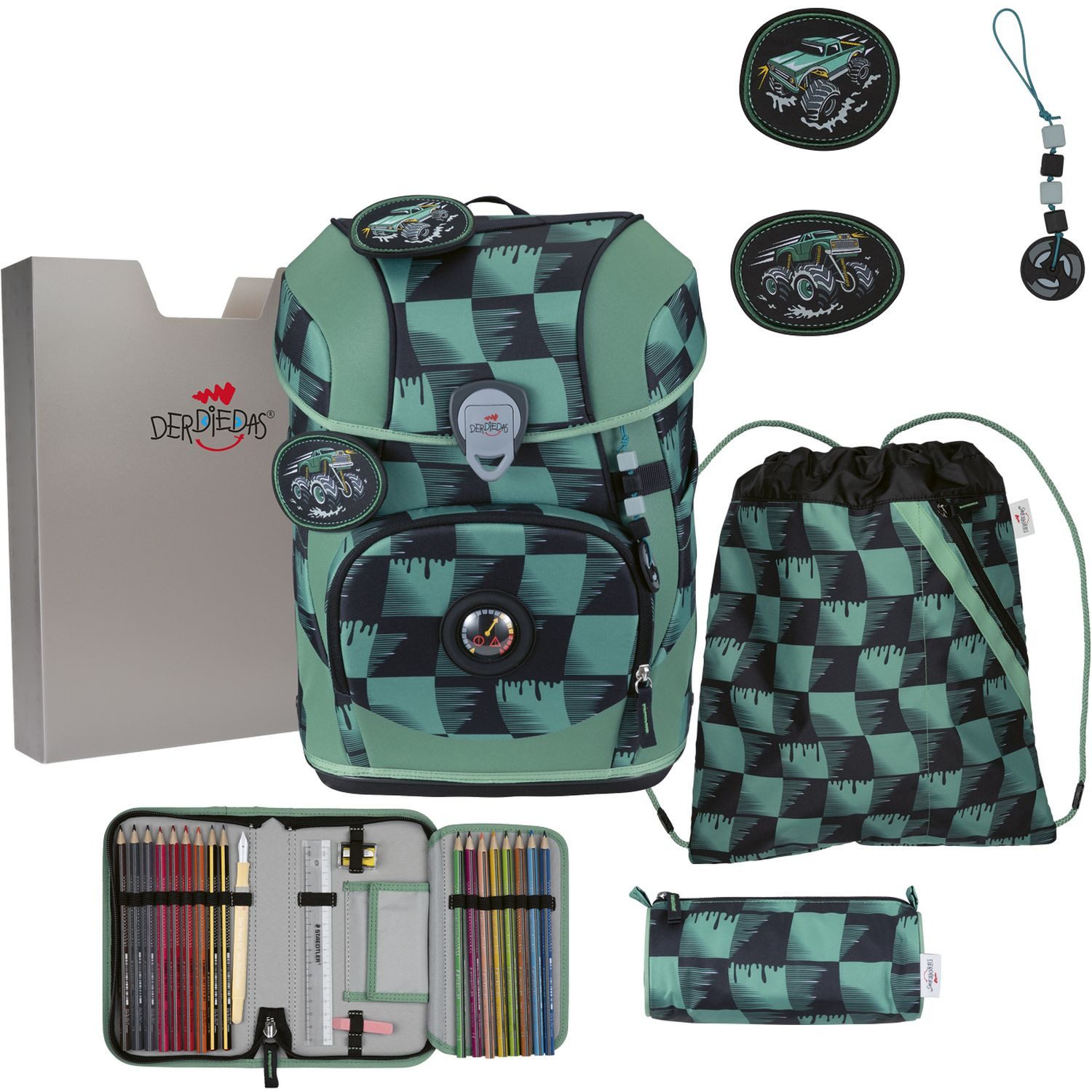 Mit nur ca. 900g Eigengewicht ist der DerDieDas Ergoflex Tiny sehr leicht. Die Ergonomie des Schulranzens wird durch die abnehmbaren Hüftgurte unterstützt. Denn die Gurte verteilen das Gewicht von den Schultern auf die Hüfte und entlasten so die Schultern Ihres Kindes. Damit die Schultergurte auch bei schnellen Bewegungen, wie z.B. beim Toben, nicht ständig verrutschen, besitzt der Ergoflex Tiny einen höhenverstellbaren Brustgurt, um die Schultergurte zu fixieren. Die stabile Bodenplatte mit den vier kleinen Stellfüßen sorgt für einen sicheren Stand und schützt den Schulranzen vor Schmutz und Nässe. Trotz des geringen Eigengewichts bietet der Ergoflex Tiny ausreichend Stauraum. In den beiden Seitentaschen können die Trinkflasche oder der Regenschirm Ihres Kindes sicher verstaut werden. In der großen Fronttasche können die Brotbox untergebracht werden. Auch für das Federmäppchen gibt es ein Extra-Fach. Die retroreflektierenden Flächen an Front, Deckel und den Seiten, erhöhen die Sichtbarkeit Ihres Kindes in Straßenverkehr.