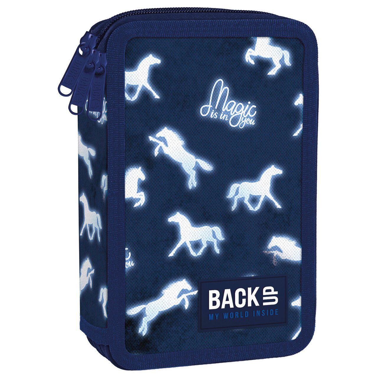 18 Buntstiften, 18 Filzstiften, 1 Radiergummi, 1 Spitzer, 1 Lineal, 3 Kugelschreiber (rot, schwarz und blau), und 1 Bleistift.