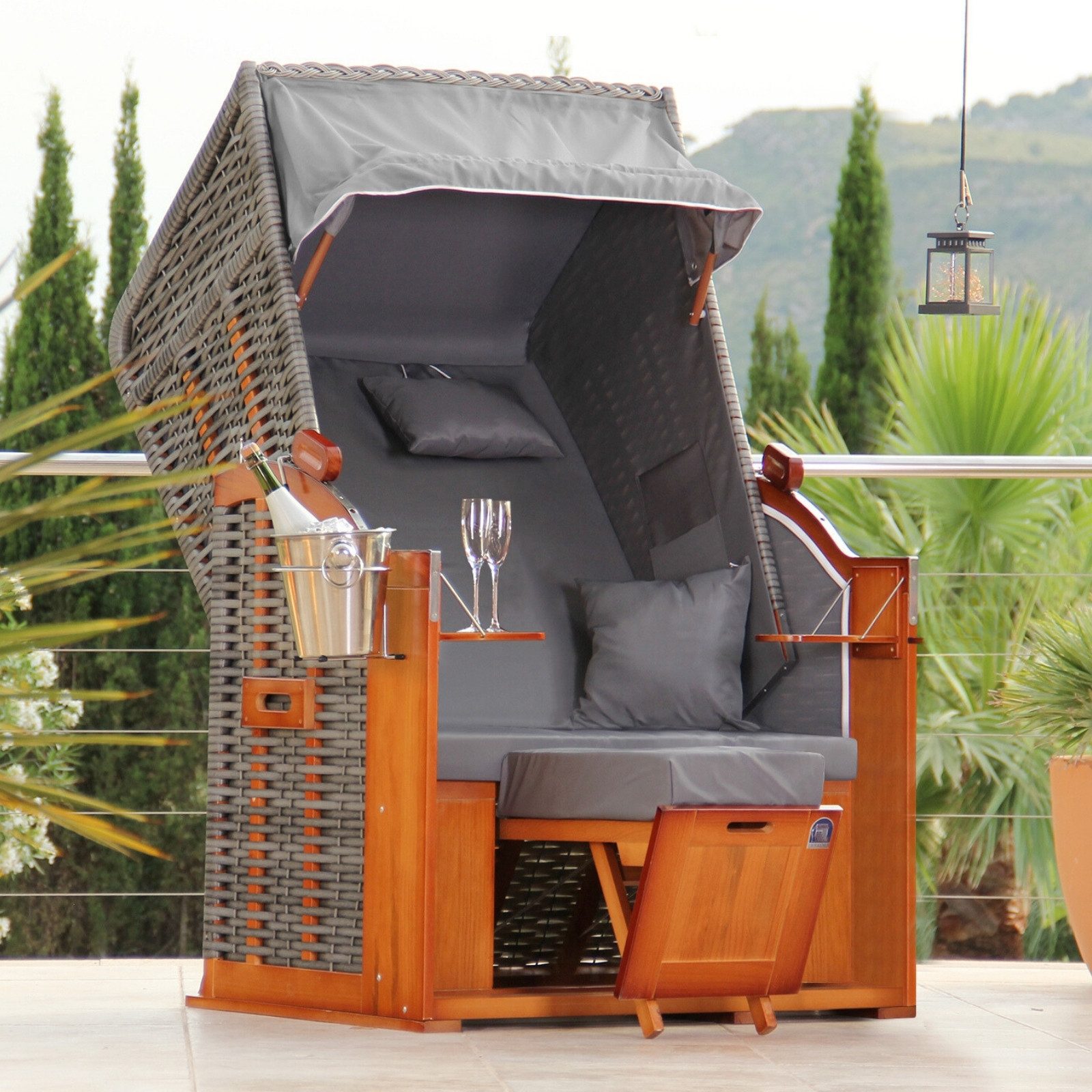 Ihr neuer Strandkorb wird bereits montiert geliefert, inklusive 4 Strandkorbrollen, was eine einfache Positionierung ermöglicht. Freuen Sie sich auf zusätzlichen Komfort durch zwei klappbare Klapptische, Wurf- und Nackenkissen sowie einem extra dicken Fußkissen. Die hochwertige Verarbeitung verleiht dem Strandkorb eine einzigartige Optik und Stabilität.