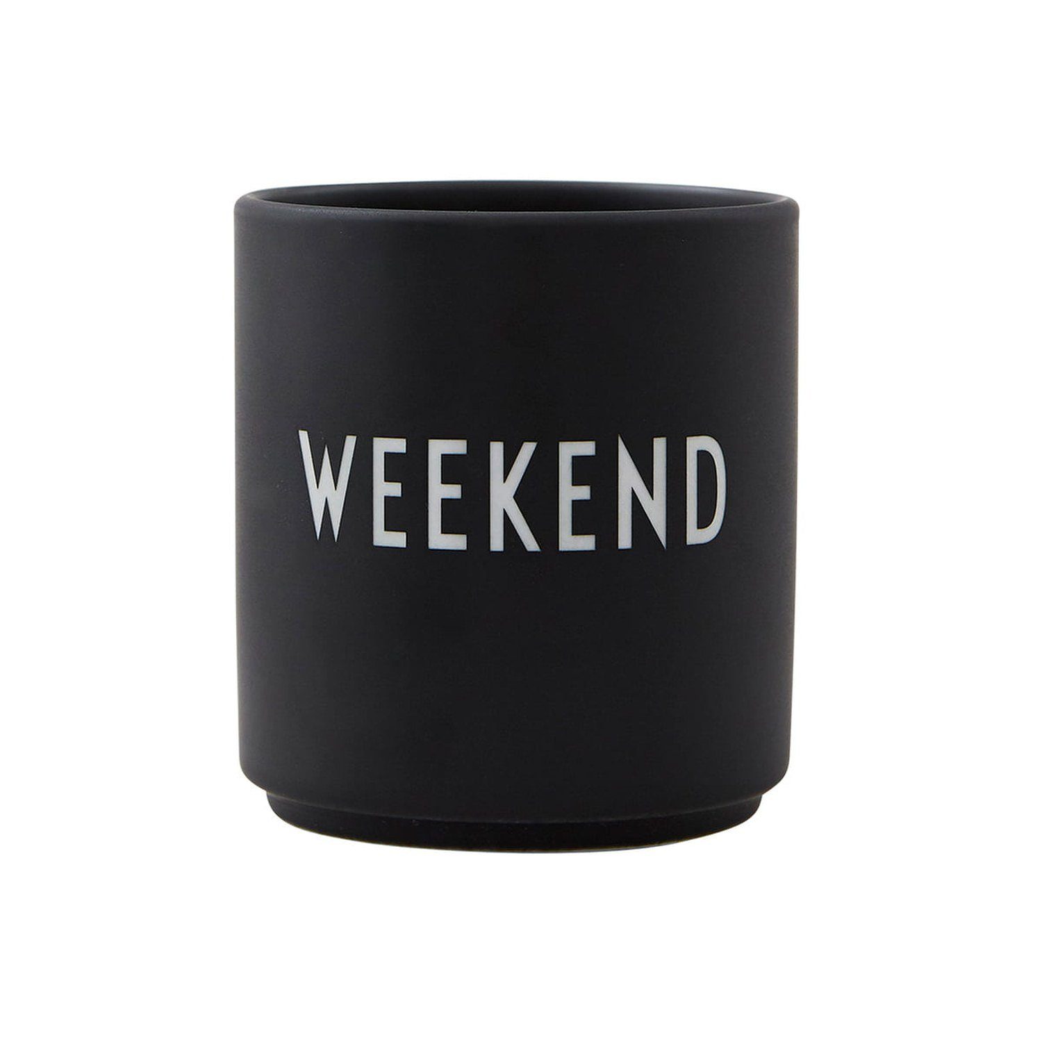 Die schnörkellose und geradlinige Typographie, die Arne Jacobsen 1937 entwarf, ist noch heute ein modernes und dekoratives Dekor für die Porzellanbecher der Firma Design Letters. Der scwharze Becher aus Fine Bone China mit der Aufschrift Weekend ist nicht nur in der Küche ein edler Blickfang, sondern eignet sich auch auf dem Schreibtisch zum Halten von Stiften oder im Badezimmer als Ablage für kleine Alltagsgegenstände. Der Becher ist neun Zentimeter hoch und hat einen Durchmesser von 8,3 cm. Er hat ein Fassungsvermögen von 325 ml und ist für die Reinigung in der Spülmaschine geeignet.