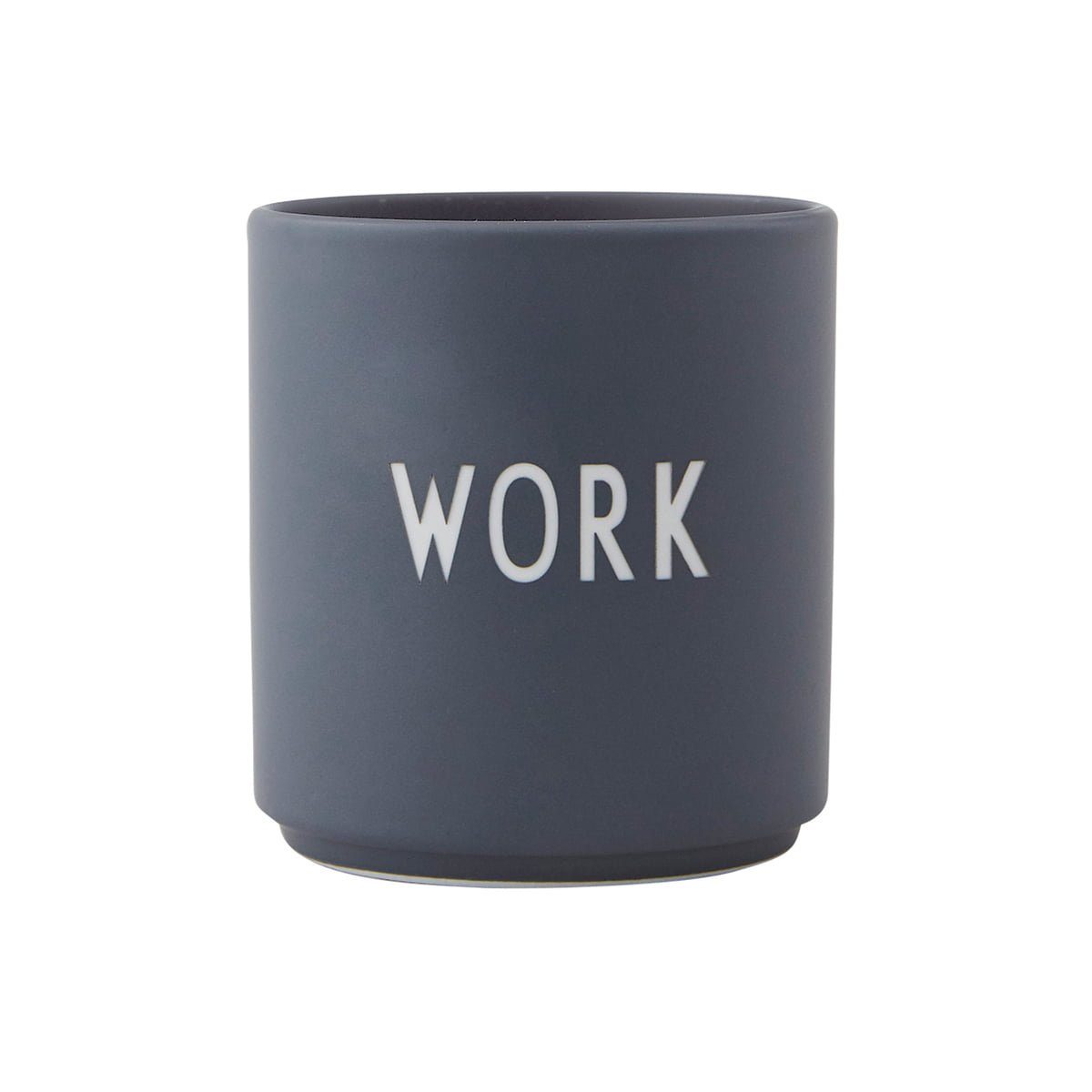 Die schnörkellose und geradlinige Typographie, die Arne Jacobsen 1937 entwarf, ist noch heute ein modernes und dekoratives Dekor für die Porzellanbecher der Firma Design Letters. Der graue Becher aus Fine Bone China mit der Aufschrift Work ist nicht nur in der Küche ein edler Blickfang, sondern eignet sich auch auf dem Schreibtisch zum Halten von Stiften oder im Badezimmer als Ablage für kleine Alltagsgegenstände. Der Becher ist neun Zentimeter hoch und hat einen Durchmesser von 8,3 cm. Er hat ein Fassungsvermögen von 325 ml und ist für die Reinigung in der Spülmaschine geeignet.