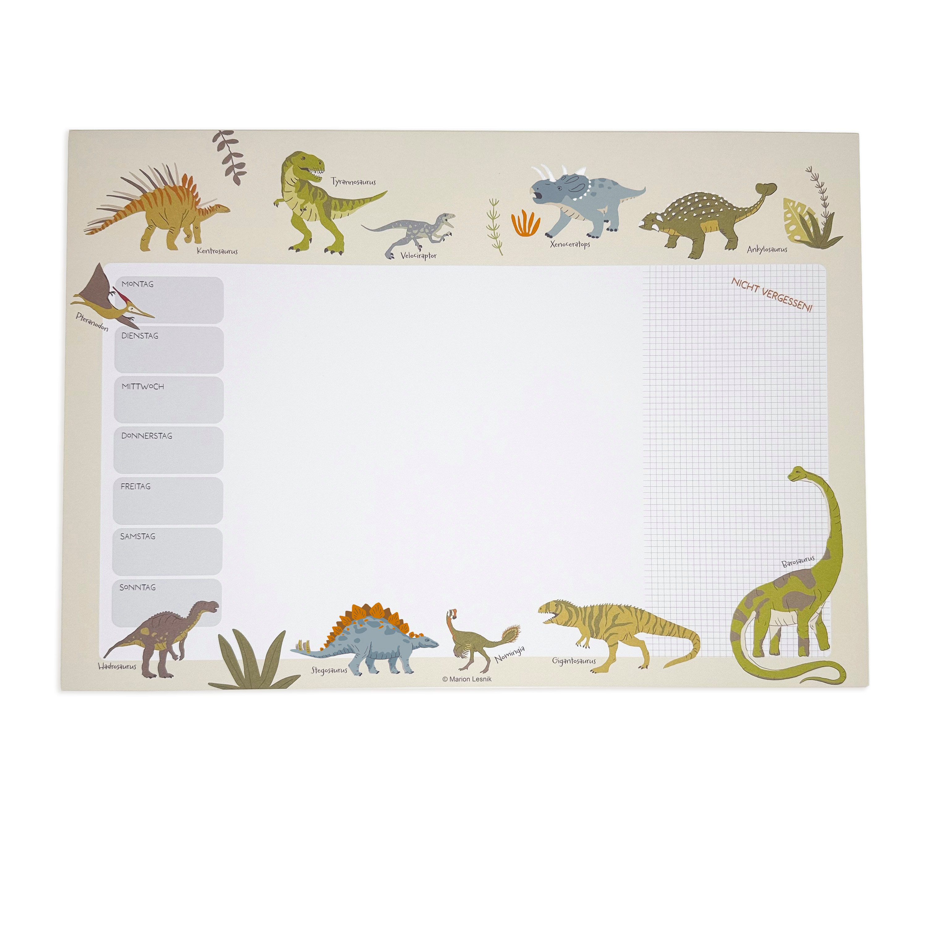 Diese tolle Schreibtischunterlage mit coolen handgezeichneten Dinos, eignet sich nicht nur prima um die Woche zu organisieren, sondern auch um die Namen der Lieblings-Dinos zu erfahren. Die freie Fläche kann zum notieren was nicht vergessen werden darf oder malen eigener, großartiger Kunstwerke genützt werden. Eine schöne und praktische Geschenkidee zum Schulstart für die Grundschule.
