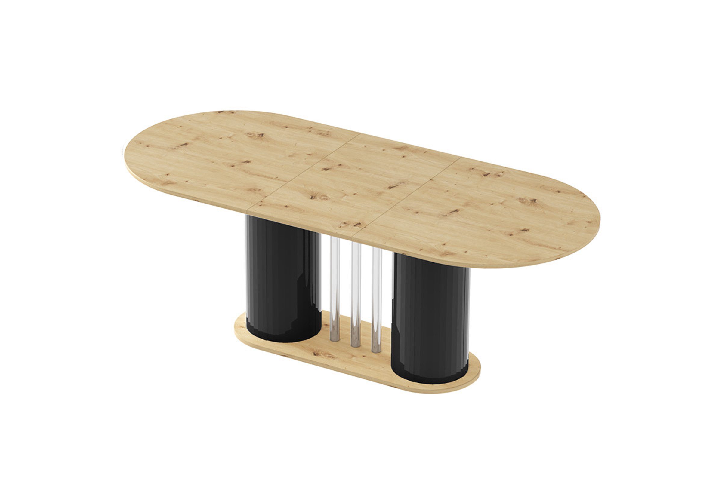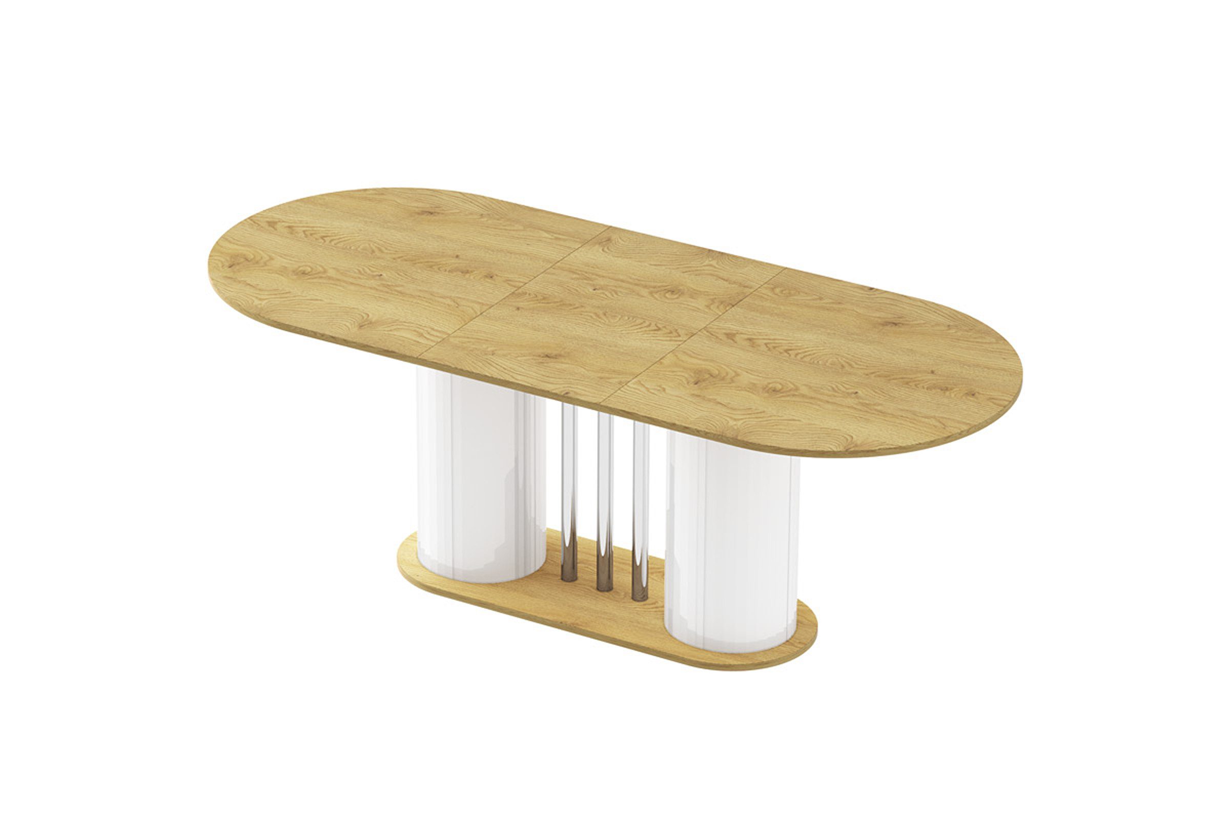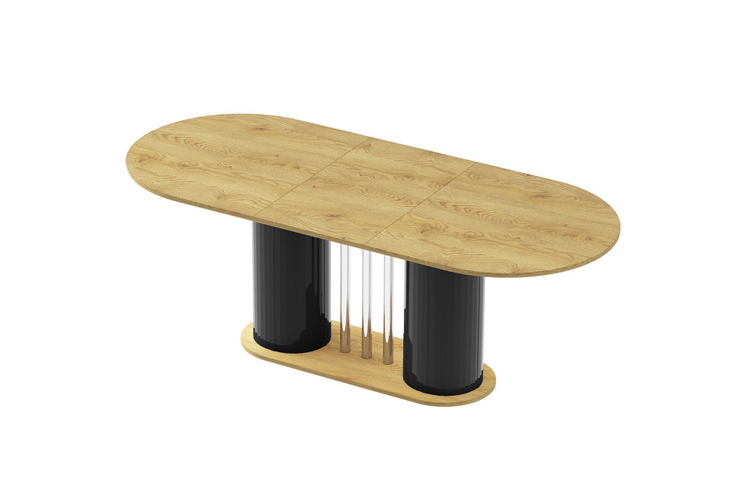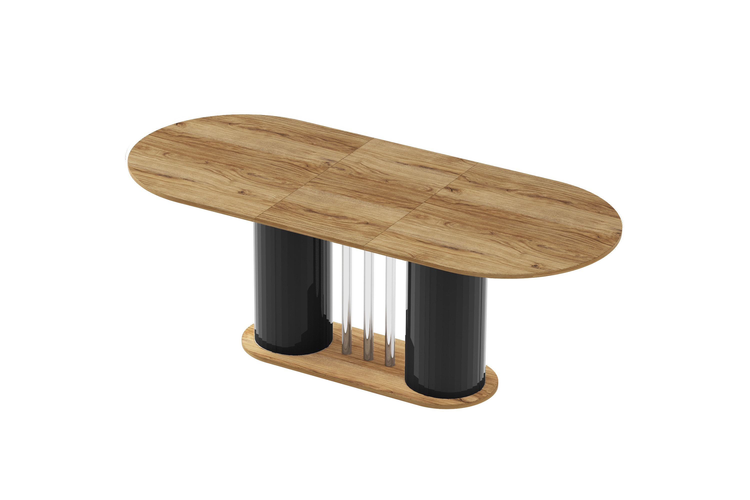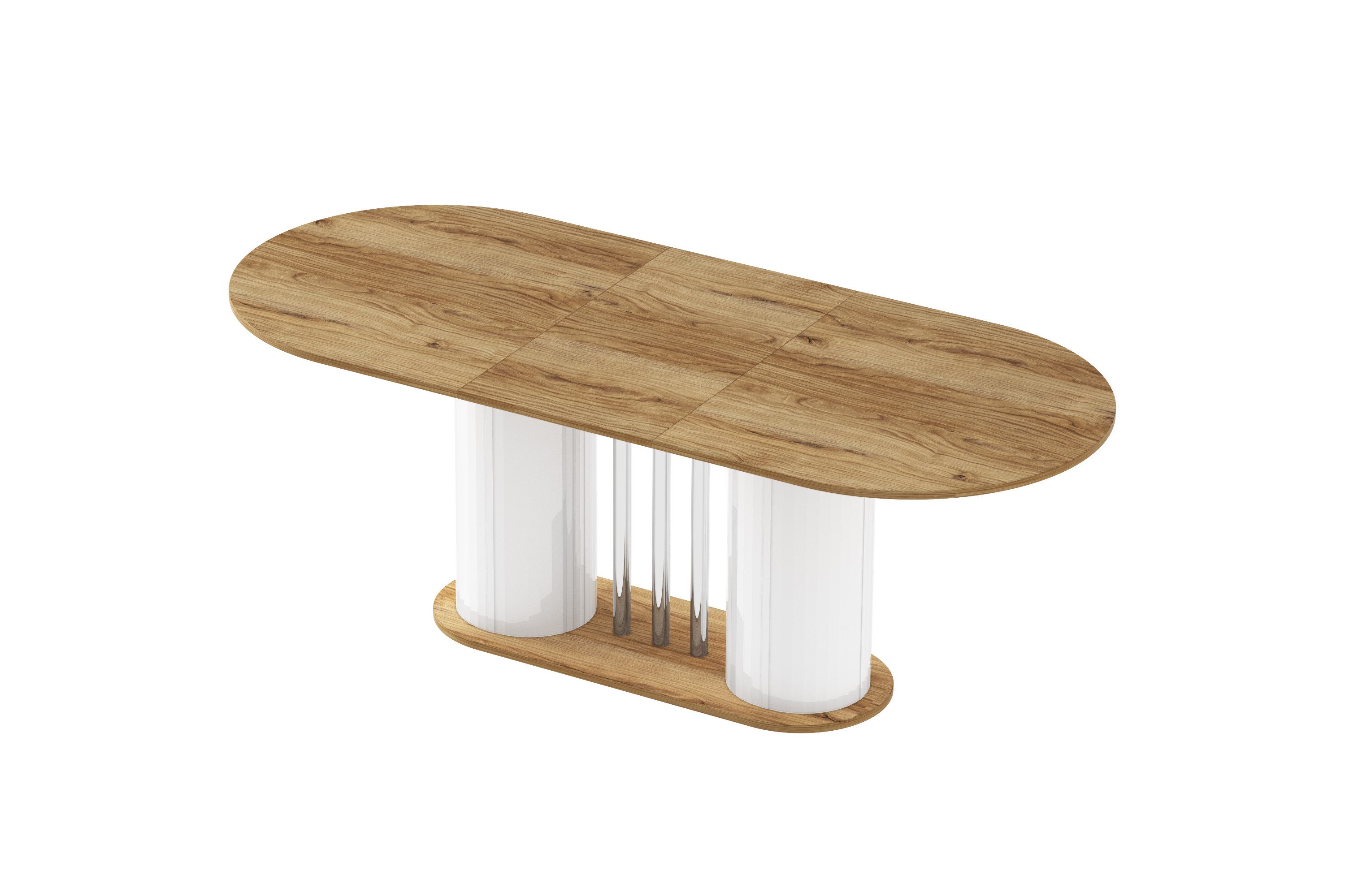 Ein wunderschöner und sehr praktischer ovaler Esstisch, der sich in der Длина ausziehen lässt. Um die Длина des Tisches zu vergrößern, werden die beiden Oberplatten auseinandergezogen (durch das Ziehen nur einer Platte bewegt sich automatisch die andere - "Synchronauszug") und das Verlängerungselement (sind im Tisch verstaut) werden aus der Mitte nach oben genommen. Dieser Funktionstisch ist sowohl von seiner Erscheinung, als auch von seiner Funktionalität etwas besonderes. Durch seine Geradlinigkeit entsteht ein stilvolles und zeitloses Design, wodurch in Ihren Räumlichkeiten neue Akzente gesetzt werden. Die Oberfläche des Tisches ist extrem hochglänzend und wird daher mit einer Schutzfolie beschiechtet geliefert, welche erst nach dem Aufbau abgezogen werden sollte.