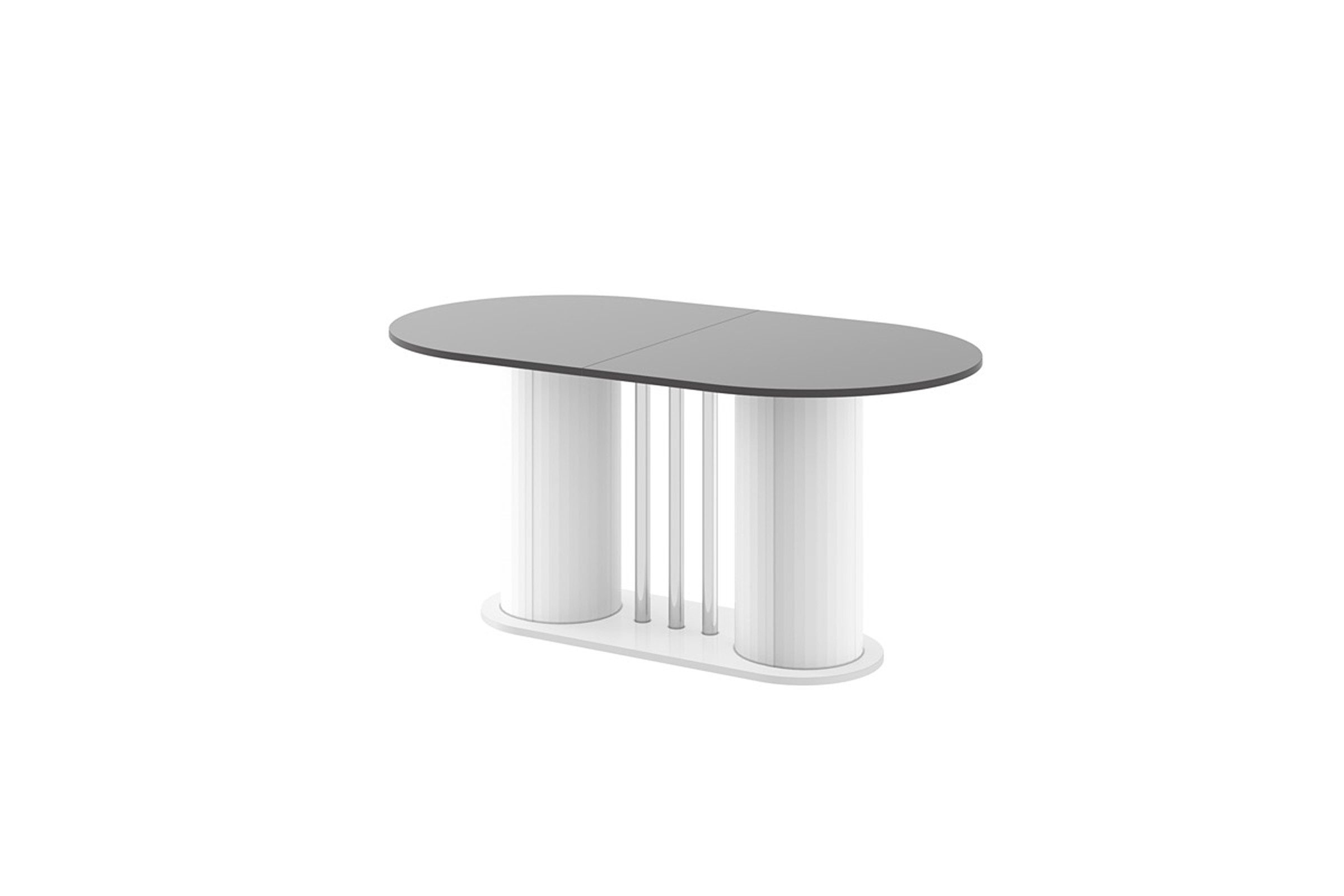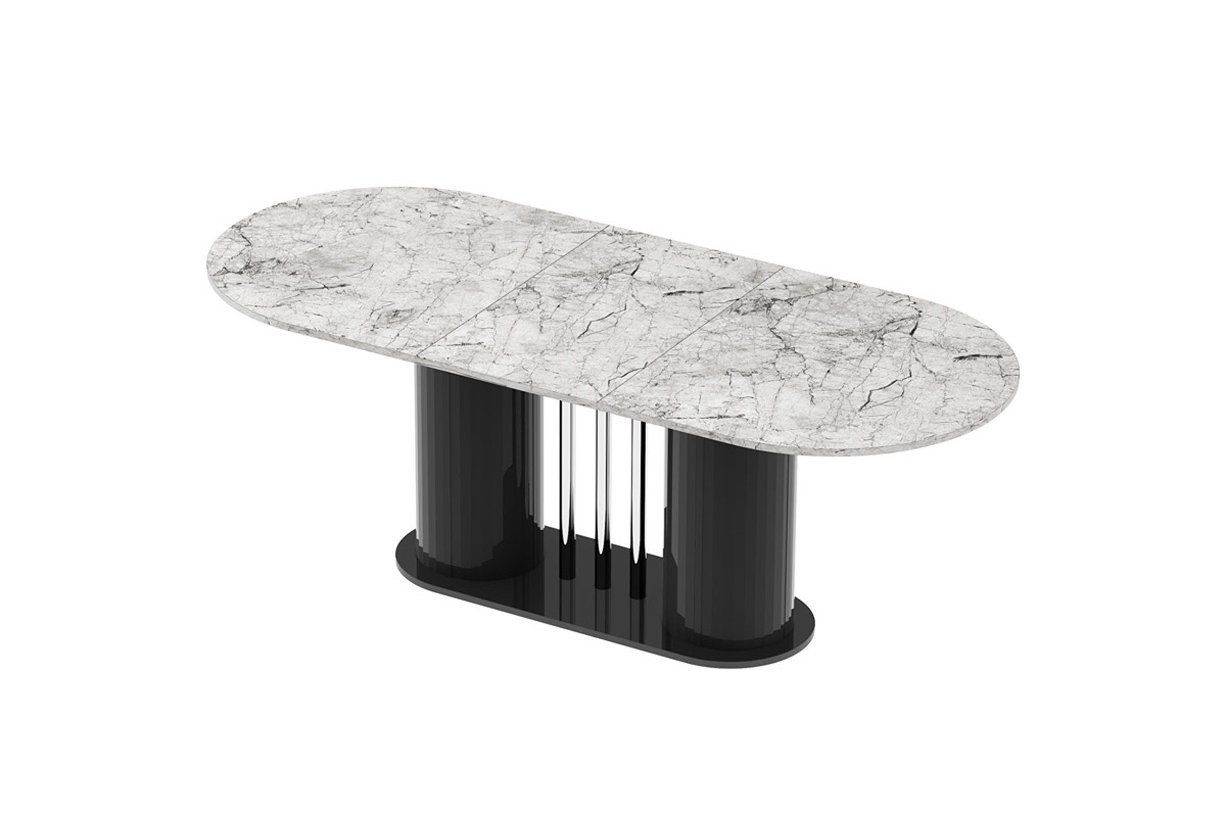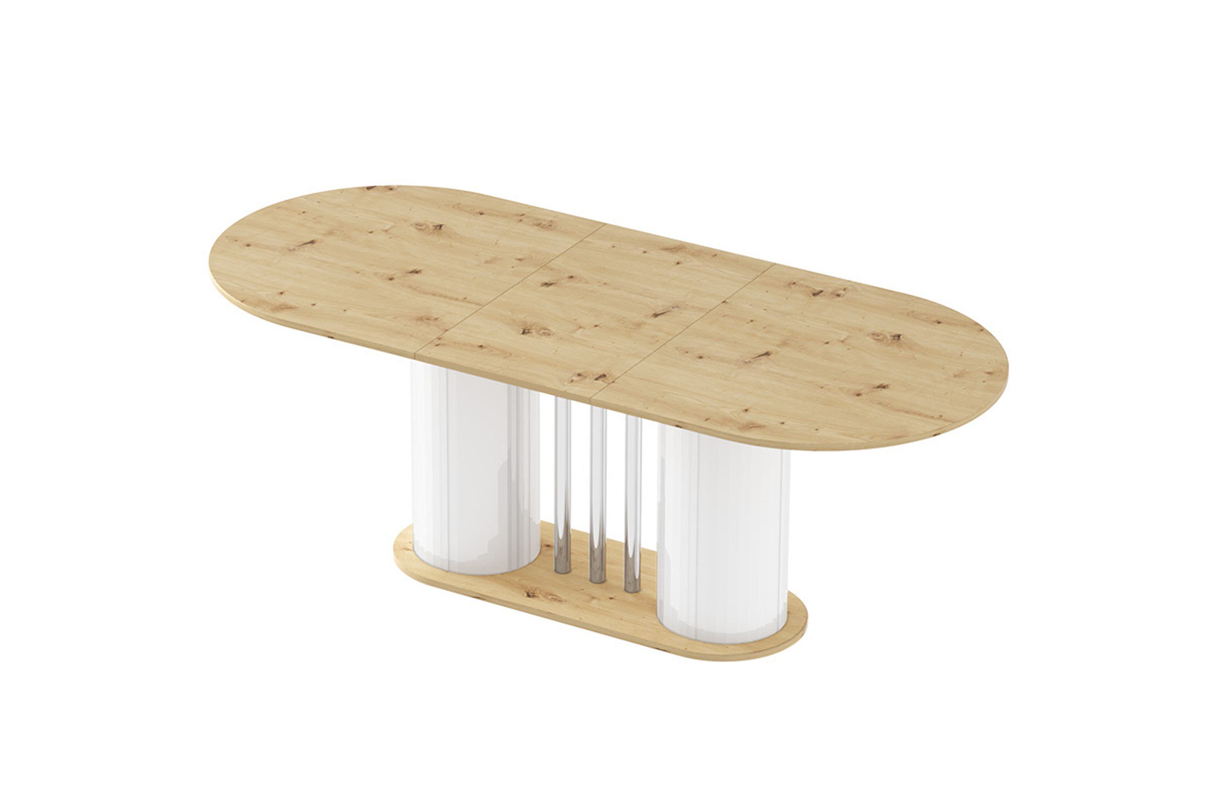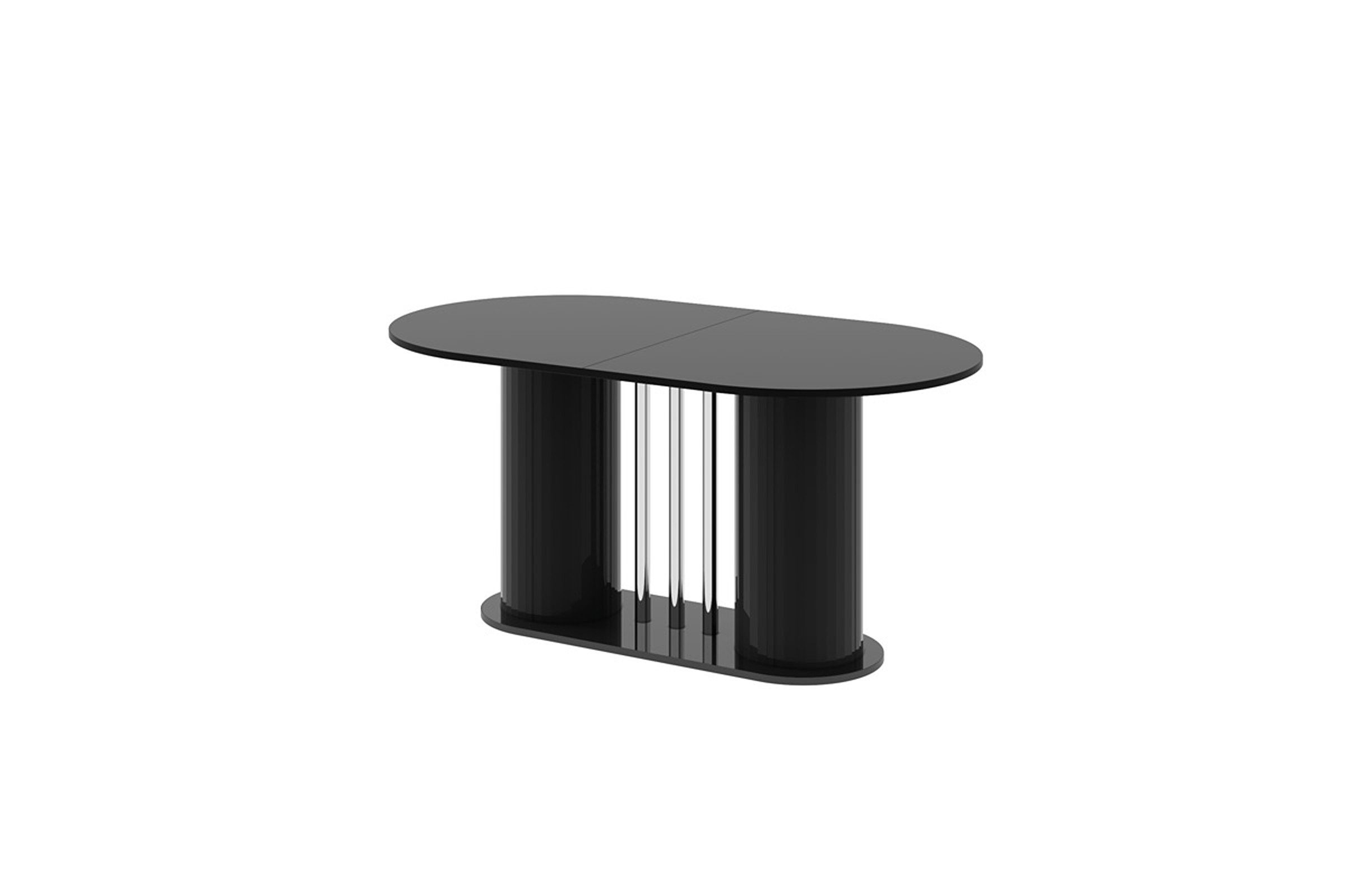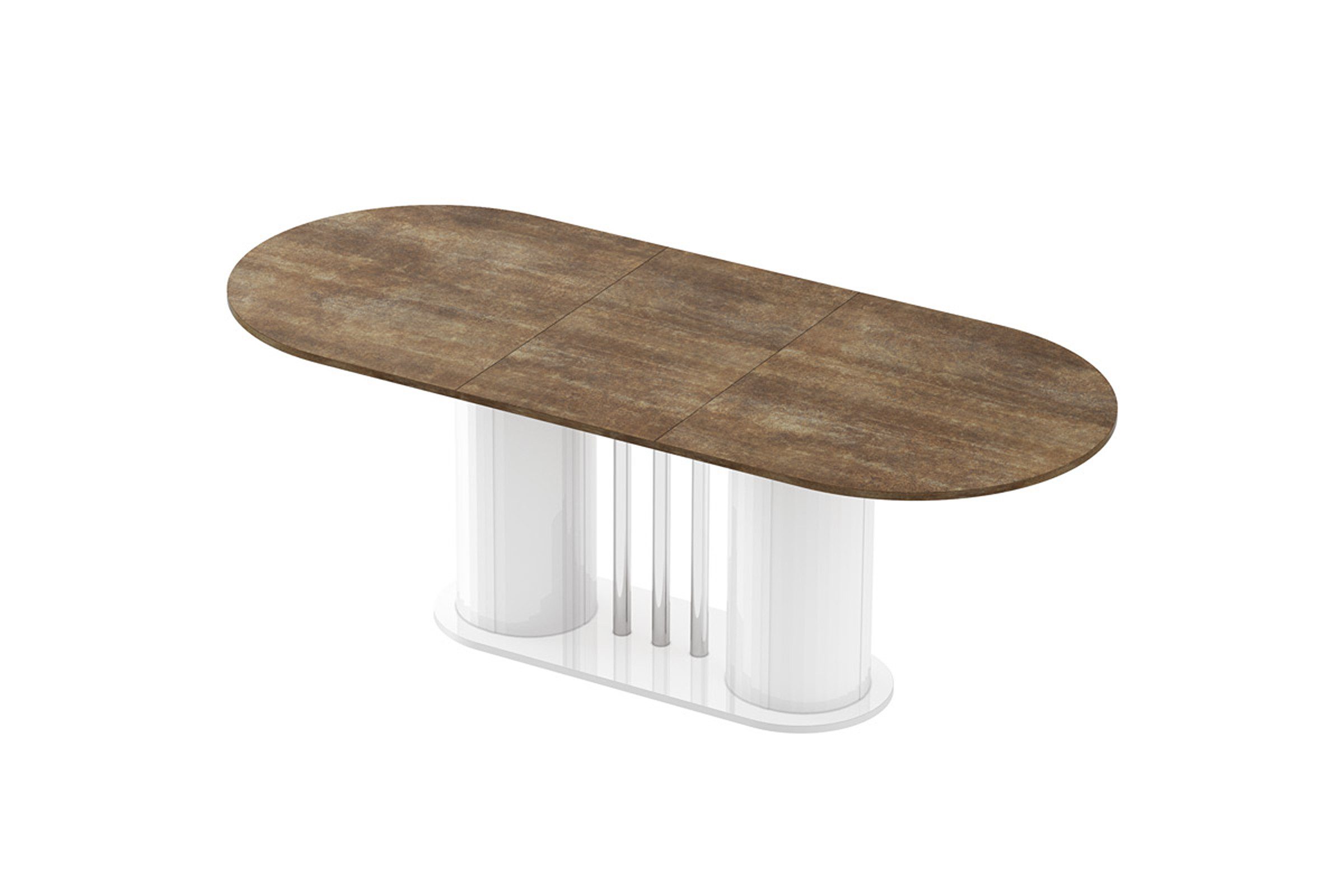 Ein wunderschöner und sehr praktischer ovaler Esstisch, der sich in der Длина ausziehen lässt. Um die Длина des Tisches zu vergrößern, werden die beiden Oberplatten auseinandergezogen (durch das Ziehen nur einer Platte bewegt sich automatisch die andere - "Synchronauszug") und das Verlängerungselement (sind im Tisch verstaut) werden aus der Mitte nach oben genommen. Dieser Funktionstisch ist sowohl von seiner Erscheinung, als auch von seiner Funktionalität etwas besonderes. Durch seine Geradlinigkeit entsteht ein stilvolles und zeitloses Design, wodurch in Ihren Räumlichkeiten neue Akzente gesetzt werden. Die Oberfläche des Tisches ist extrem hochglänzend und wird daher mit einer Schutzfolie beschiechtet geliefert, welche erst nach dem Aufbau abgezogen werden sollte.