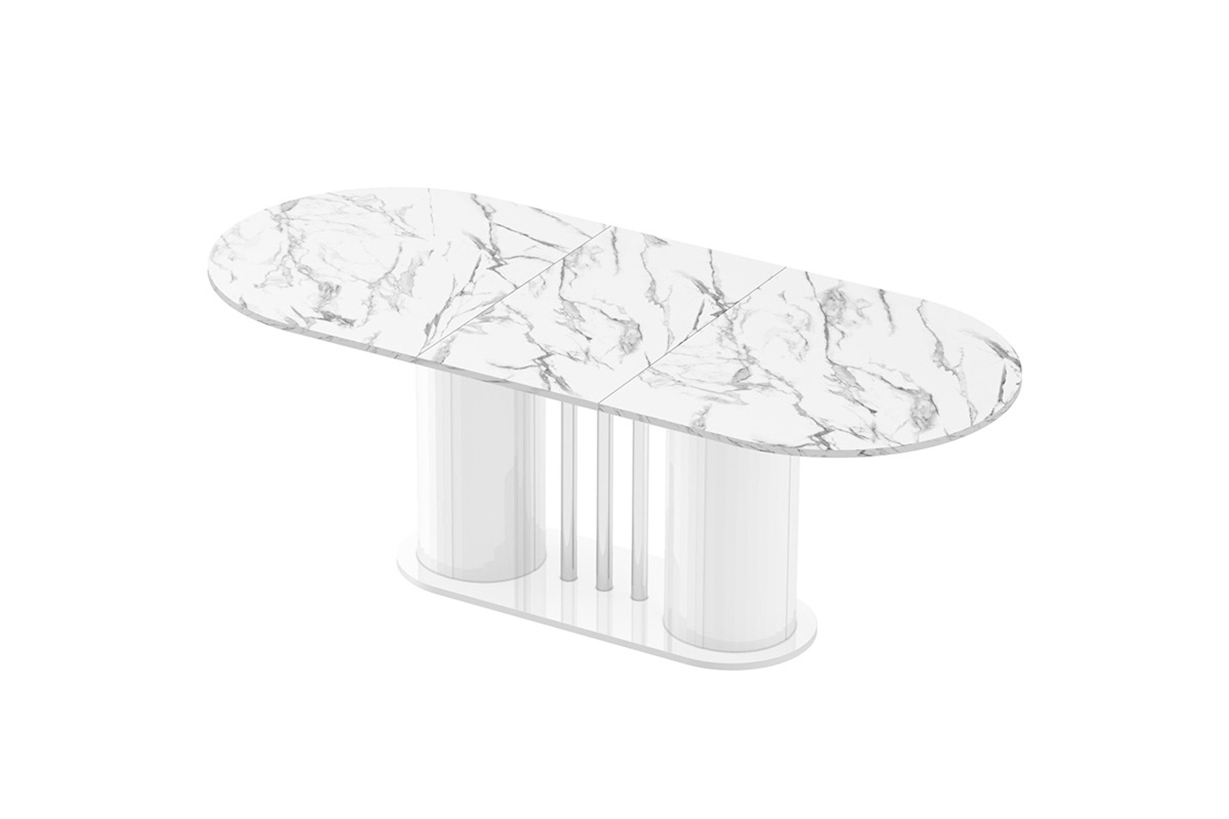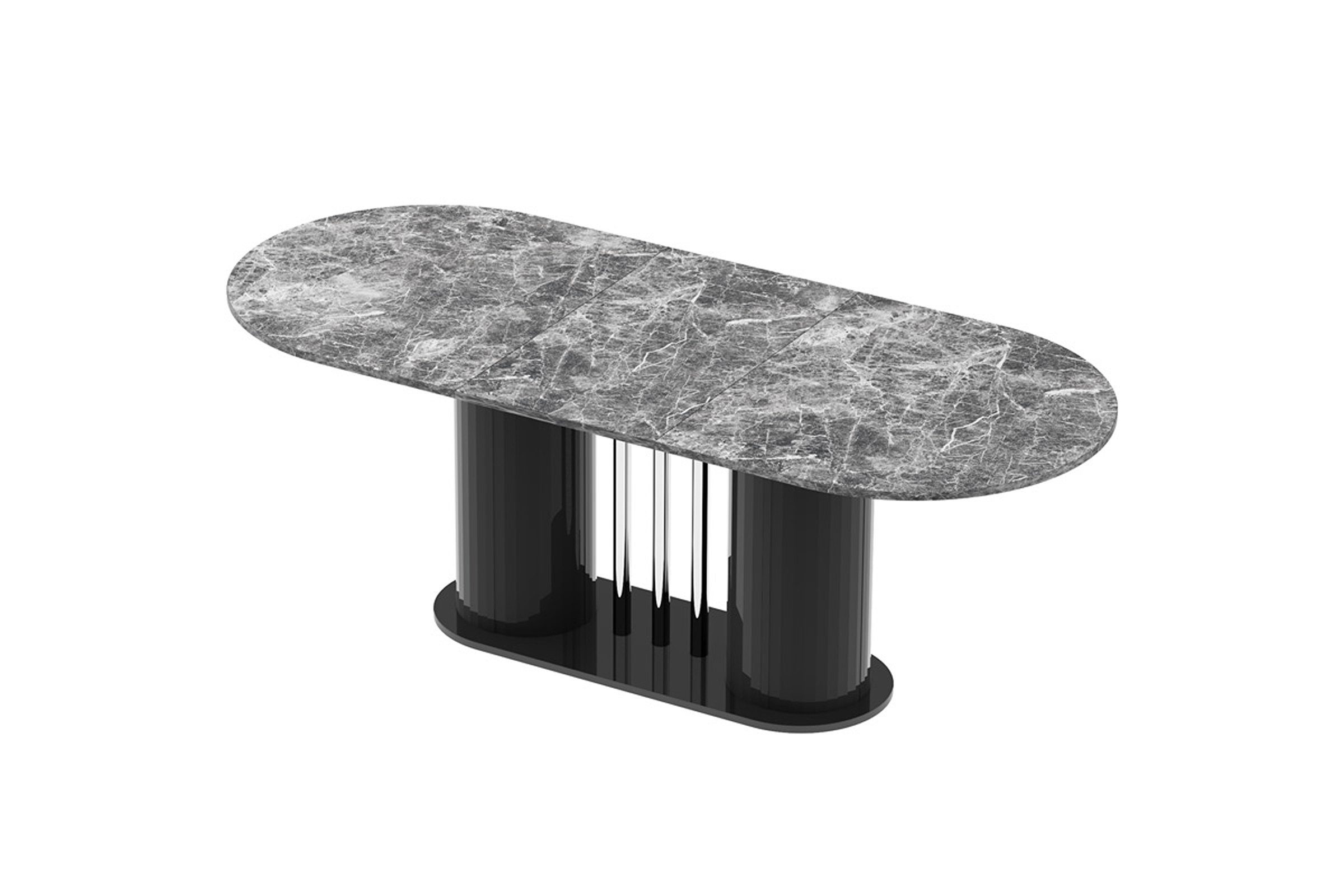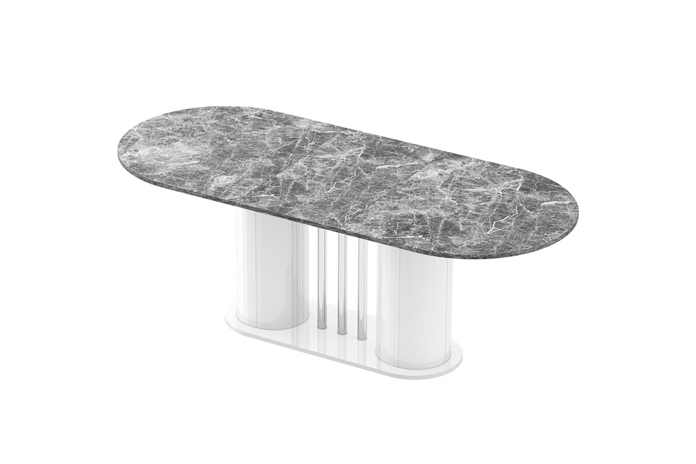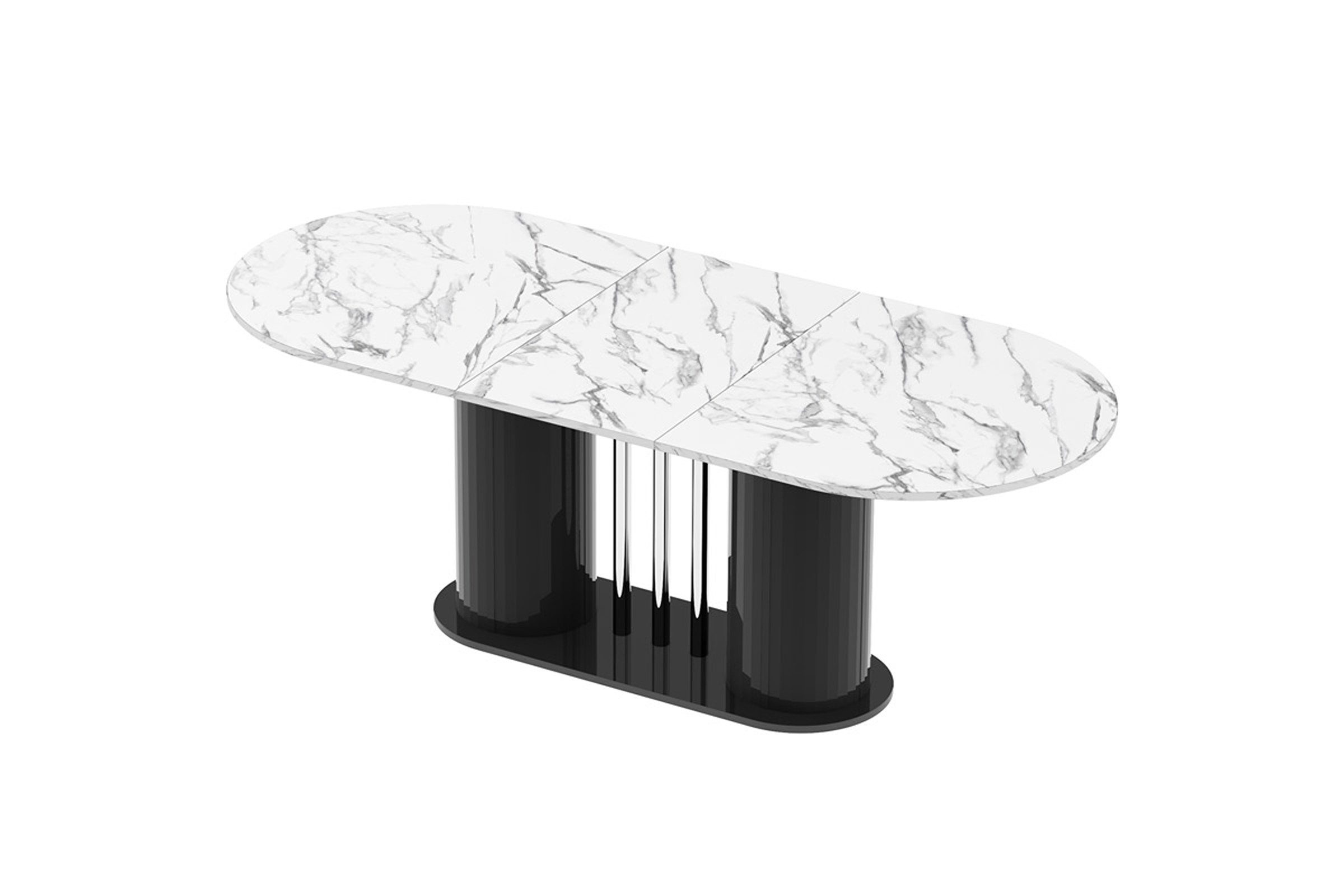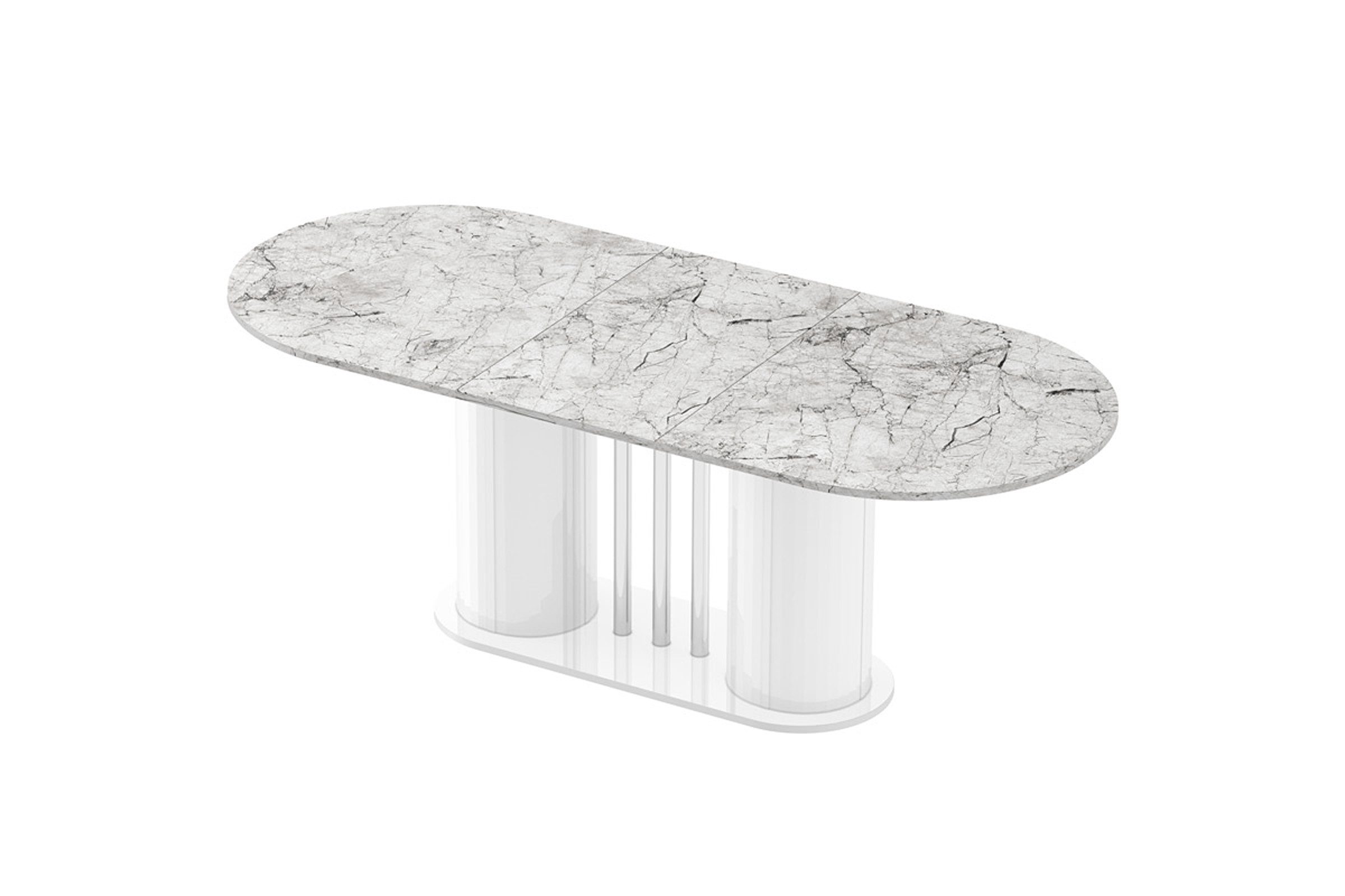 Ein wunderschöner und sehr praktischer ovaler Esstisch, der sich in der Длина ausziehen lässt. Um die Длина des Tisches zu vergrößern, werden die beiden Oberplatten auseinandergezogen (durch das Ziehen nur einer Platte bewegt sich automatisch die andere - "Synchronauszug") und das Verlängerungselement (sind im Tisch verstaut) werden aus der Mitte nach oben genommen. Dieser Funktionstisch ist sowohl von seiner Erscheinung, als auch von seiner Funktionalität etwas besonderes. Durch seine Geradlinigkeit entsteht ein stilvolles und zeitloses Design, wodurch in Ihren Räumlichkeiten neue Akzente gesetzt werden. Die Oberfläche des Tisches ist extrem hochglänzend und wird daher mit einer Schutzfolie beschiechtet geliefert, welche erst nach dem Aufbau abgezogen werden sollte.