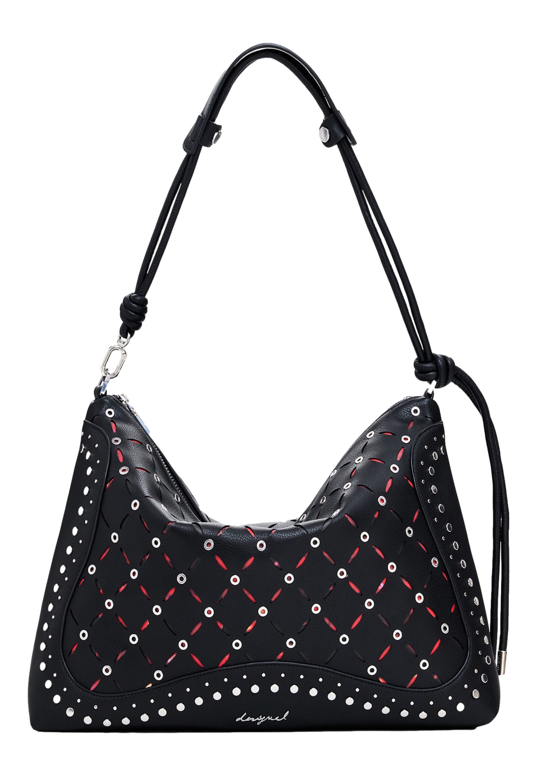 Diese Handtasche kombiniert raffiniertes Design mit funktionaler Ausstattung. Das großflächige Nieten-Lochmuster verleiht ihr einen markanten Look, während das kontrastfarbene Innenfutter stilvolle Akzente setzt. Das geräumige Hauptfach ist mit einem Reißverschluss gesichert und bietet ein zusätzliches Reißverschlussfach für wichtige Kleinigkeiten. Zwei abnehmbare Riemen ermöglichen vielseitige Tragevarianten – als Schulter- oder Handtasche. Der Henkel ist mit einem praktischen Schulterschutz und dekorativem Knotenelement ausgestattet. Der metallische Label-Schriftzug auf der Front verleiht der Tasche einen hochwertigen Touch. Im Inneren rundet ein Labelpatch das durchdachte Design ab. Die Tasche ist nicht nur ein modisches Statement, sondern auch ein funktionales Alltagsaccessoire. Ob für Freizeit oder City-Look – sie passt zu vielen Gelegenheiten. Eine Tasche mit Charakter und Stil.