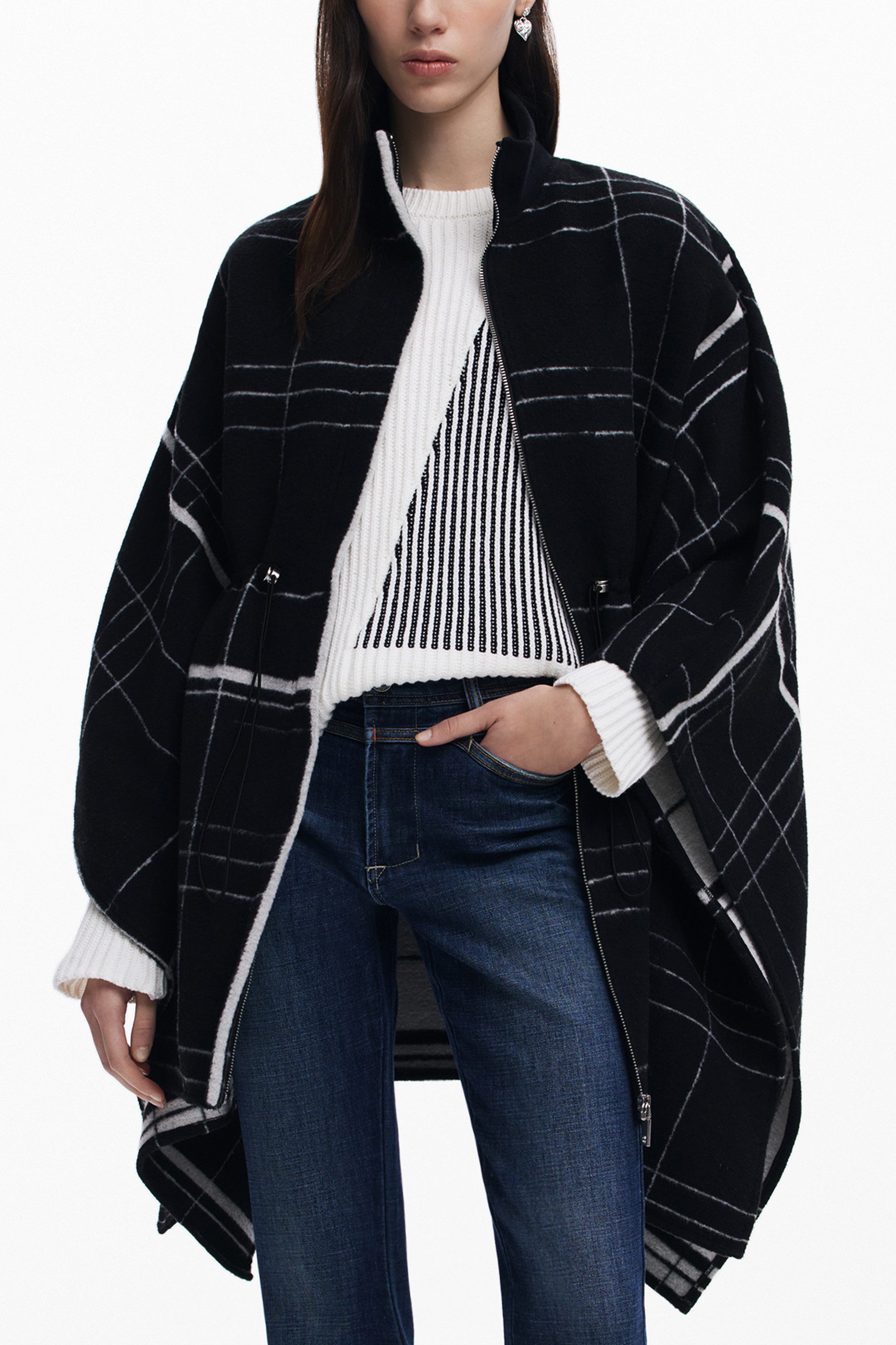 Besondere Merkmale | Stylischer Damen Poncho mit Karomuster und Kontrastdetails in Schwarz |