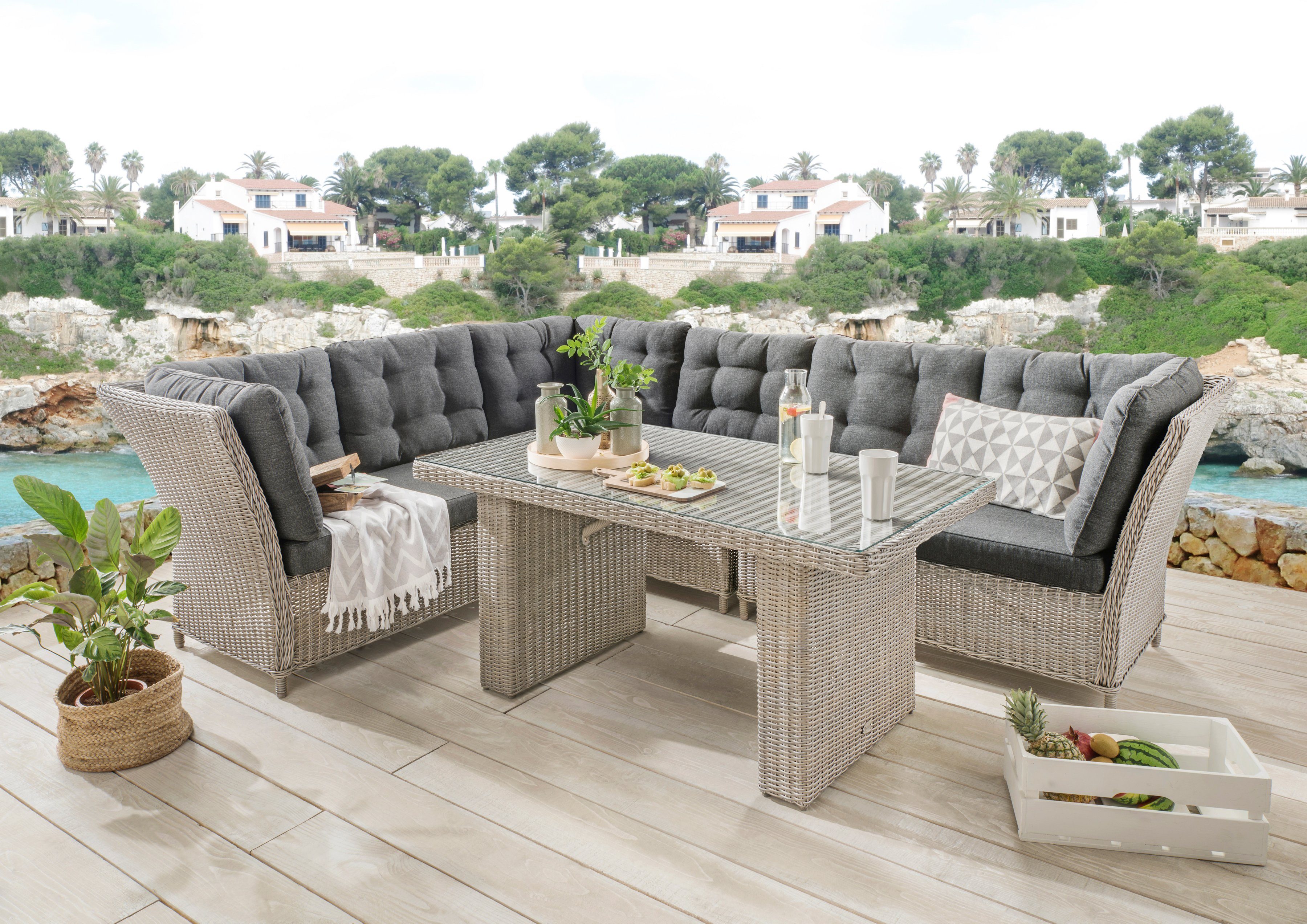 Lieferumfang | 2x Schenkel, 1x Eckmodul, 1x Singlemodul, 1x Tisch, Auflagen, Montagematerial und Aufbauanleitung |
