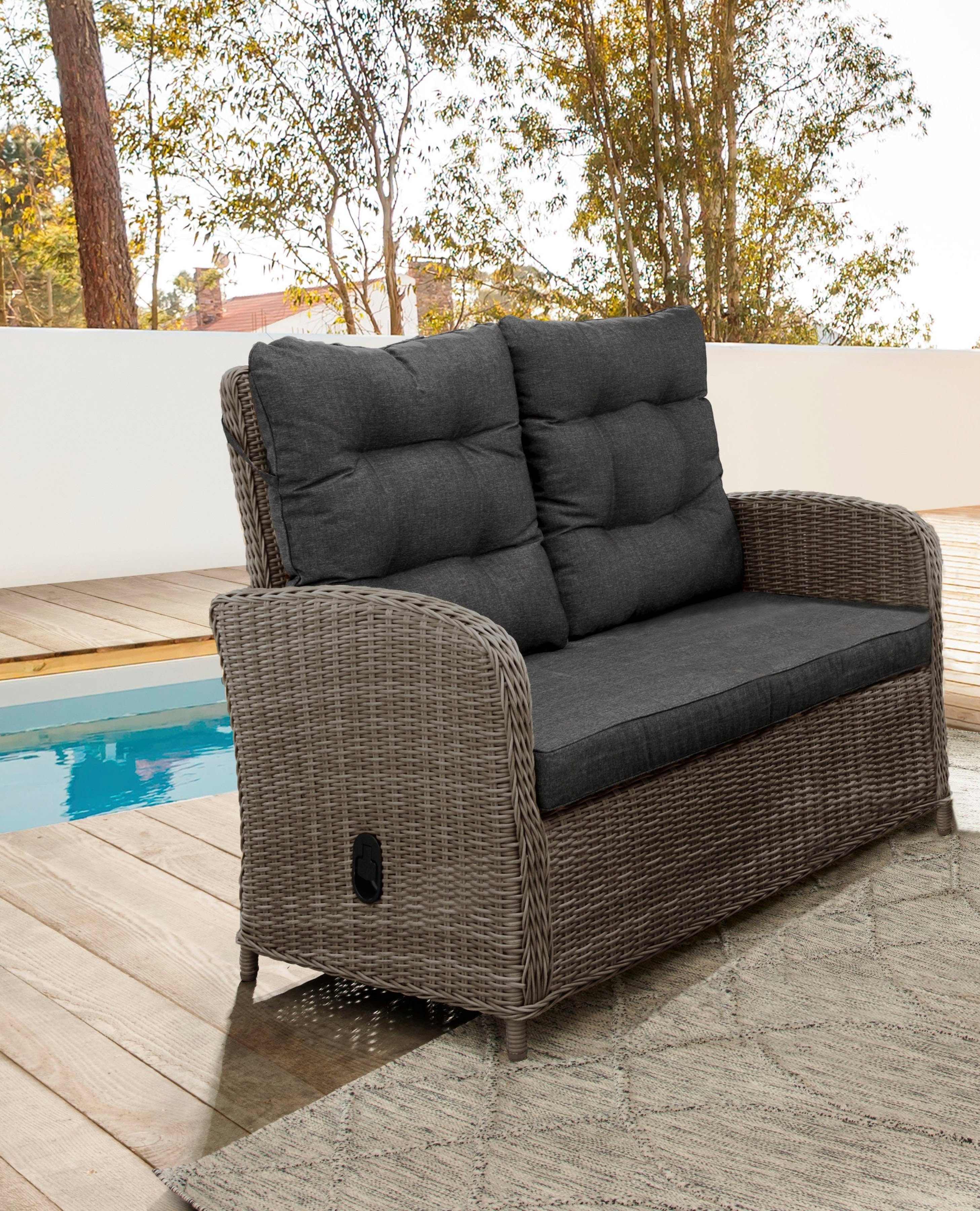 Benannt nach der wunderschönen Stadt in den Südtiroler Alpen, bringt die Gartenmöbelserie »Merano II« frischen Wind in den Garten. Bei dem dazugehörigen Loungesofa lassen sich die extrahohen Rückenlehnen mittels Gasdruckfeder einzeln und stufenlos verstellen. Für noch mehr Sitzkomfort sorgen die wunderbar weich gepolsterten Sitzauflagen in der Trendfarbe Pearl Shell. Die Gartenmöbel aus sandfarbenem Polyrattan sind pflegeleicht, Aluminiumgestelle sorgen für Stabilität.