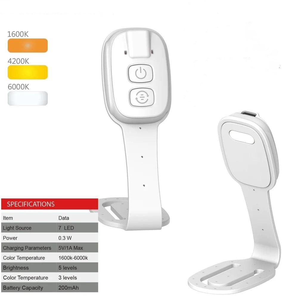 Das wiederaufladbare USB-Buchlicht liefert das 1600K warmes Licht / 4200K normales Licht / 6000K weißes Licht. Es kann über die Taste in 5 Helligkeitsstufen (100% -10%) eingestellt werden.