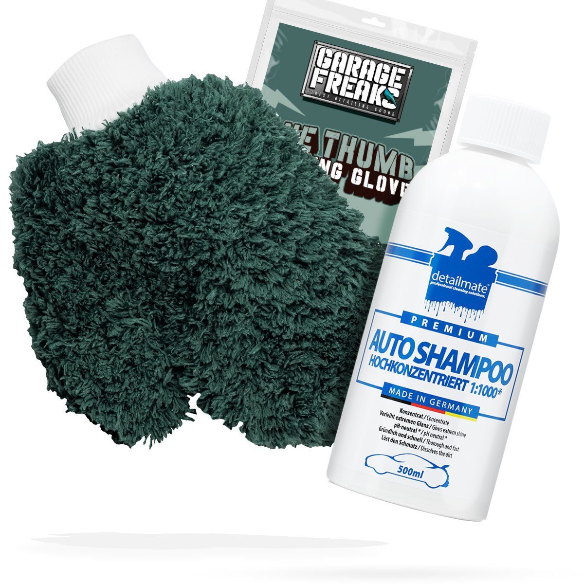 Lieferumfang | 1x Autoshampoo 1x Garage Freaks One Thumb Waschhandschuh |