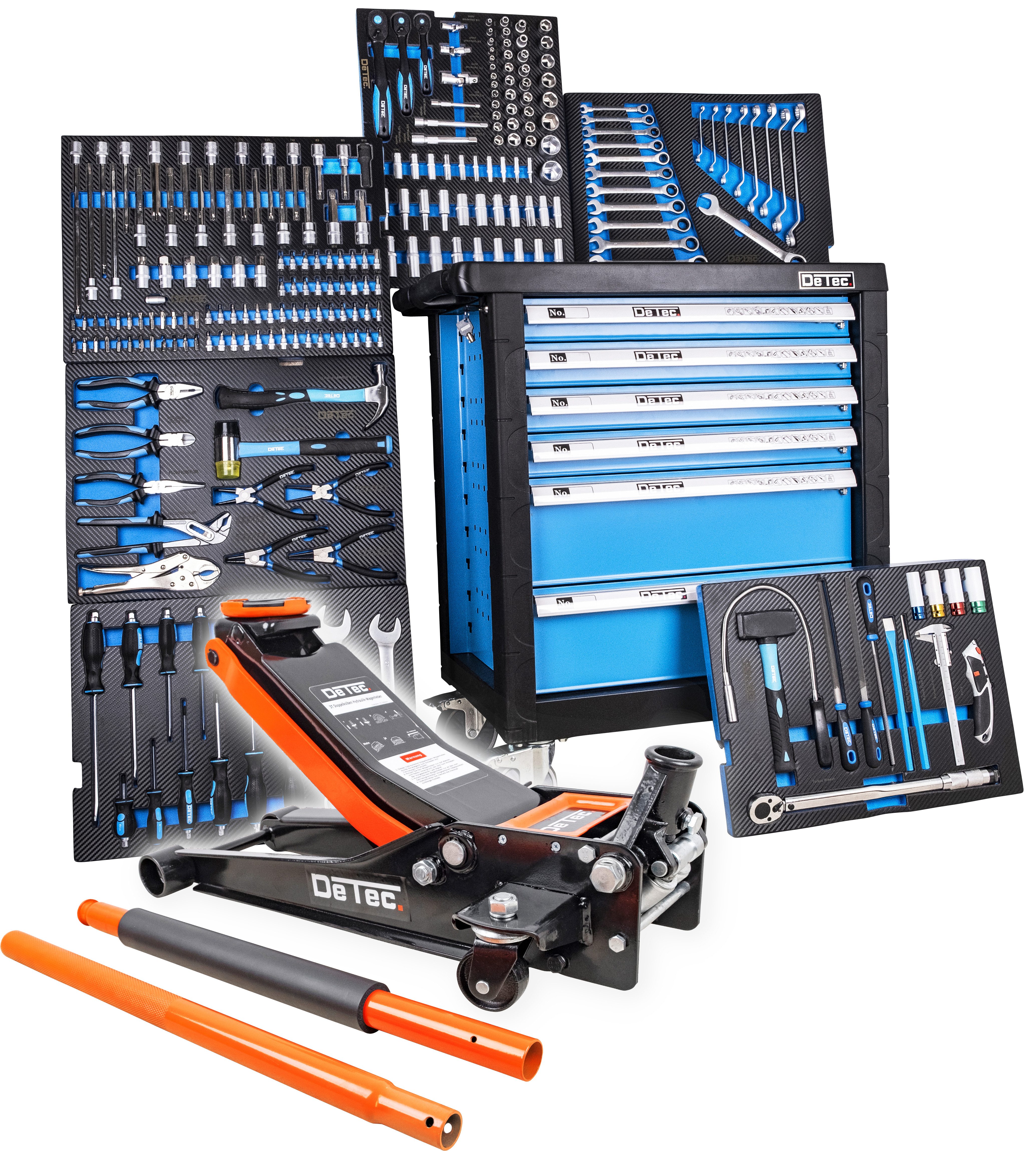 Unser Klassiker: DeTec. Werkzeugwagen 3066. Die sechs ausziehbaren Schubladen, alle mit Werkzeug bestückt sind, verfügen alle über kugelgelagerte Laufschienen. Beim Спрятать der Schubladen verriegeln diese und verhindern somit ein ungewolltes Öffnen während des Rangierens. Zum Öffnen der Schubladen betätigt man einen Taster, welcher sich unterhalb des Griffes befindet. Selbstverständlich sind die Schubladen bzw. der ganze Werkstattwagen abschließbar, zwei Schlüssel sind im Lieferumfang enthalten. Der Werkstattwagen verfügt über vier stabile Gummirollen (zwei lenkbar und zwei feststellbar) welche ein einfaches Rangieren in der Werkstatt sicherstellen. Auf dem Werkzeugwagen befindet sich eine stabile Arbeitsplatte aus Kunststoff, welche diverse Ablagemulden bietet.