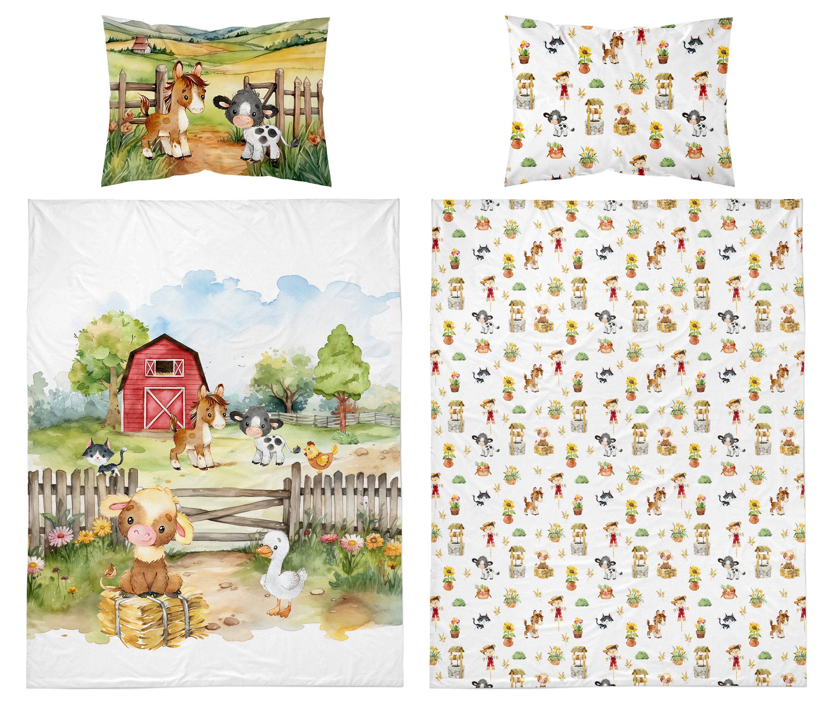 2 -teilige Bettwäsche Set Bauernof: - 1x Bettbezug 100 x 135 cm, 1x Kissenbezug 40 x 60 cm - Bettbezug und Kissenbezug mit Reißverschluss - hautfreundliche Baumwolle für beste Atmungsaktivität - Pflegehinweise: Maschinenwäsche bei 40° C, trockner geeignet, Bügeln - Material: 100% Baumwolle In diesem 2-teiligen Babybettwäsche Set kann Ihr Kind erholsam und kuschelig schlafen. Die Baby Bettwäsche ist aus hochwertigem, glattem Baumwollstoff gefertigt, dadurch garantiert optimale Atmungsaktivität und besten Schlafkomfort. Das Set besteht aus einem Bettbezug (100 x 135 cm) und einem Kissenbezug (40 x 60 cm).