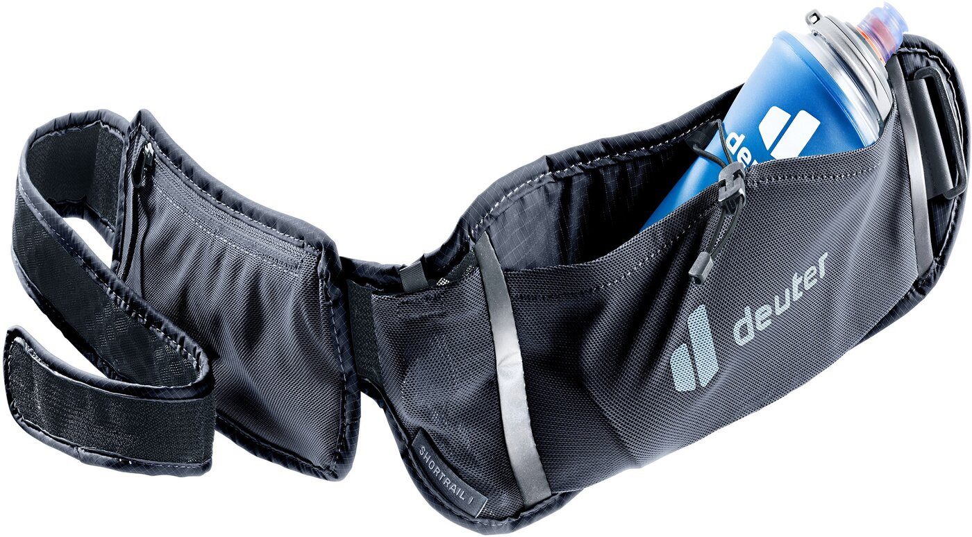 Deuter Gürteltasche Shortrail I. Running Belt für alle Minimalisten. Klett-Schlüsseltasche. Tasche für Softflask. Verschiebbare, abnehmbare Handytasche. Auf Körperumfang zuschneidbarer Bauchgurt. Reflektierende Elemente. Gewicht: 110g. Material: 100% Polyester.