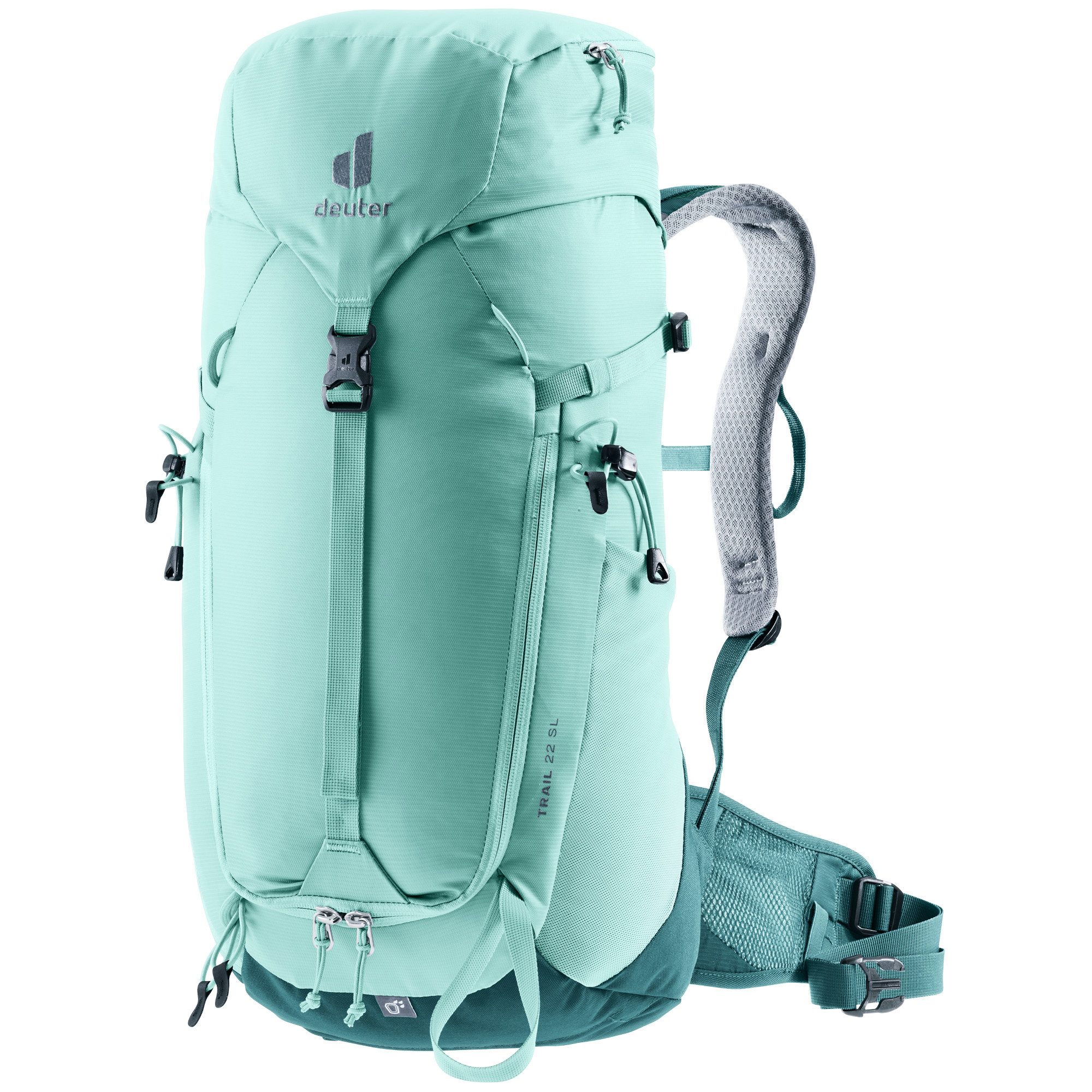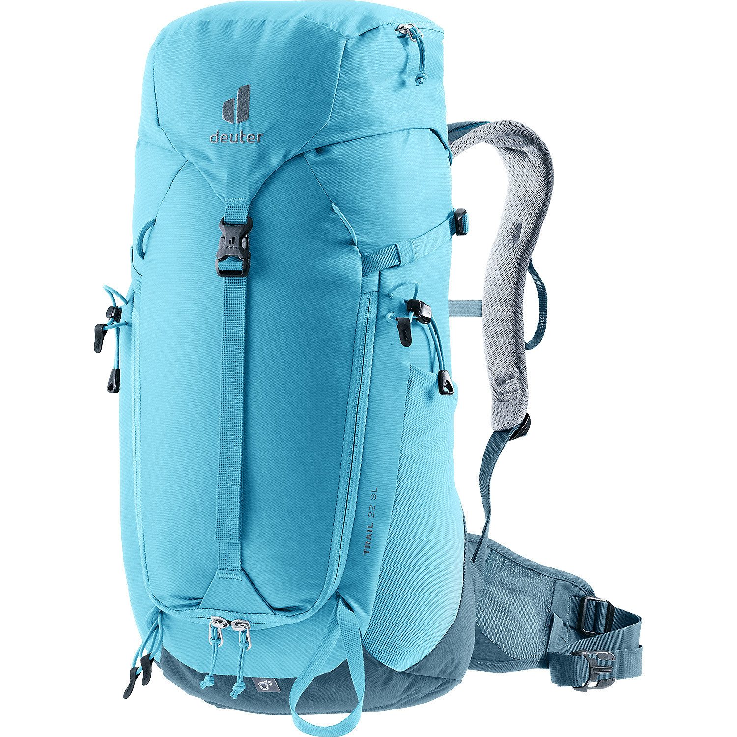 Deuter Damen Rucksack Trail 22 SL. Das Airstripes Rückensystem mit geringer Rückenauflage und großen Belüftungskanälen sowie die perforierten Schulterträger und Hüftflossen sorgen für optimale Luftzirkulation, körpernahe Gewichtsverteilung und damit einen kompakten Sitz in jedem Terrain. Die flache Deckelkonstruktion bietet gute Kopffreiheit - auch mit Helm. Dank Fixierungen an den Schulterträgern sind die Karabiner des Klettersteigsets stets griffbereit. Zudem sind Ausrüstungsgegenstände und Material dank großem Reißverschluss-Frontzugang und Seitentaschen schnell zur Hand. Volumen: 22 Liter. Maße: 58 / 24 / 20 (H x B x T) cm. Zuladungsempfehlung: 4-7 kg. Körpergröße 158-178 cm. Material: 60% Polyester, 40% Polyamid.