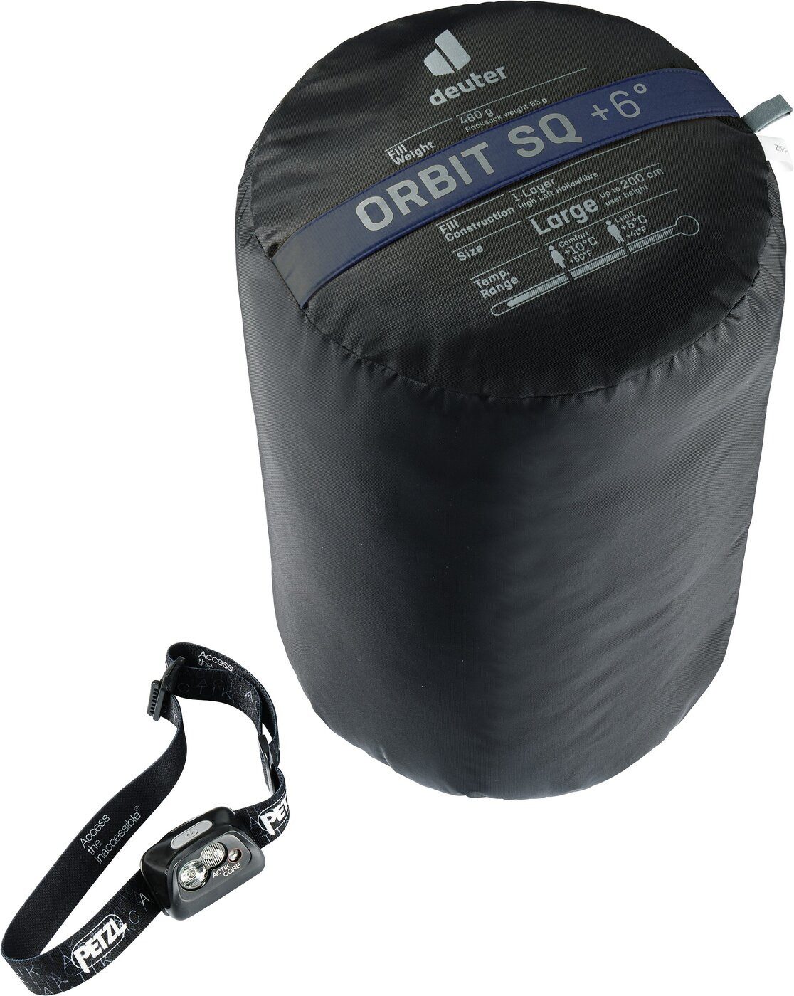 Deuter Schlafsack Orbit SQ +6°. Das Außenmaterial des Deckenschlafsacks besteht zu 100% aus recycelten Materialien. Dank der 360°-Verteilung der High-Loft Hollowfibre Füllung und dem weichen Innenbezug aus Baumwoll-Mischgewebe herrscht ein angenehmes Wärmeklima in diesem Schlafsack. Впередen Komfort bietet das abnehmbare Kopfkissen und die großzügige Beinfreiheit. Ob geöffnet als Decke oder gekoppelt als Doppelschlafsack, das robuste, leistungsfähige Obermaterial macht den Schlafsack zum strapazierfähigen und langjährigen Begleiter für Campingausflüge jeglicher Art. Abnehmbares Kopfkissen. Kuschelig weicher Innenbezug aus Baumwoll-Mischgewebe. Leichte Handhabung durch unterschiedliche Schnürzüge an der Kapuze – auch im Dunkeln. Reißverschluss-Klemmschutzband. Rundum Wärmeisolation. Shell-Außenmaterial ohne Nähte sorgt für höhere Temperaturperformance und schützt vor Eindringen von Nässe. Wertsacheninnentasche. 2-Wege-Reißverschluss. Dank umlaufendem Reißverschluss auch als Decke verwendbar. Zu 50 % recycled. PFC frei. Gewicht: 1400 g + 60 g Packsack. Volumen: 16 Liter. Füllgewicht: 125g. Schulterbreite: 79 cm. Körpergröße bis: 200 cm. Fußbreite: 79 cm. Packmaß: ø 22 cm x 41 cm. Füllmaterial: HIGH-LOFT HOLLOWFIBRE. Hauptmaterial: HIGH-LOFT HOLLOWFIBRE, DEUTER T/C COTTON HYBRID FABRIC.