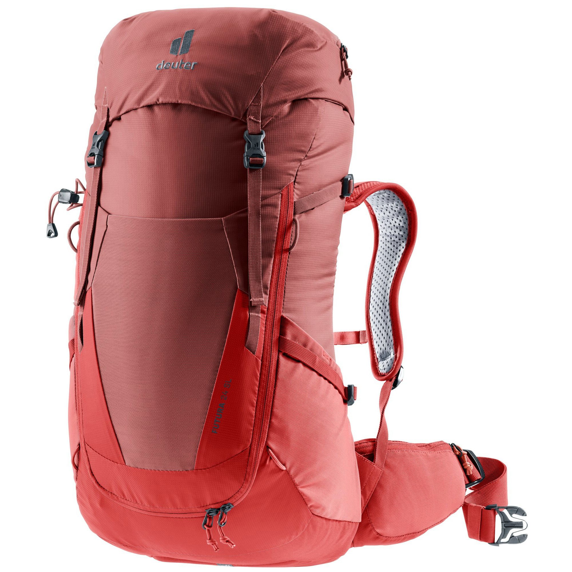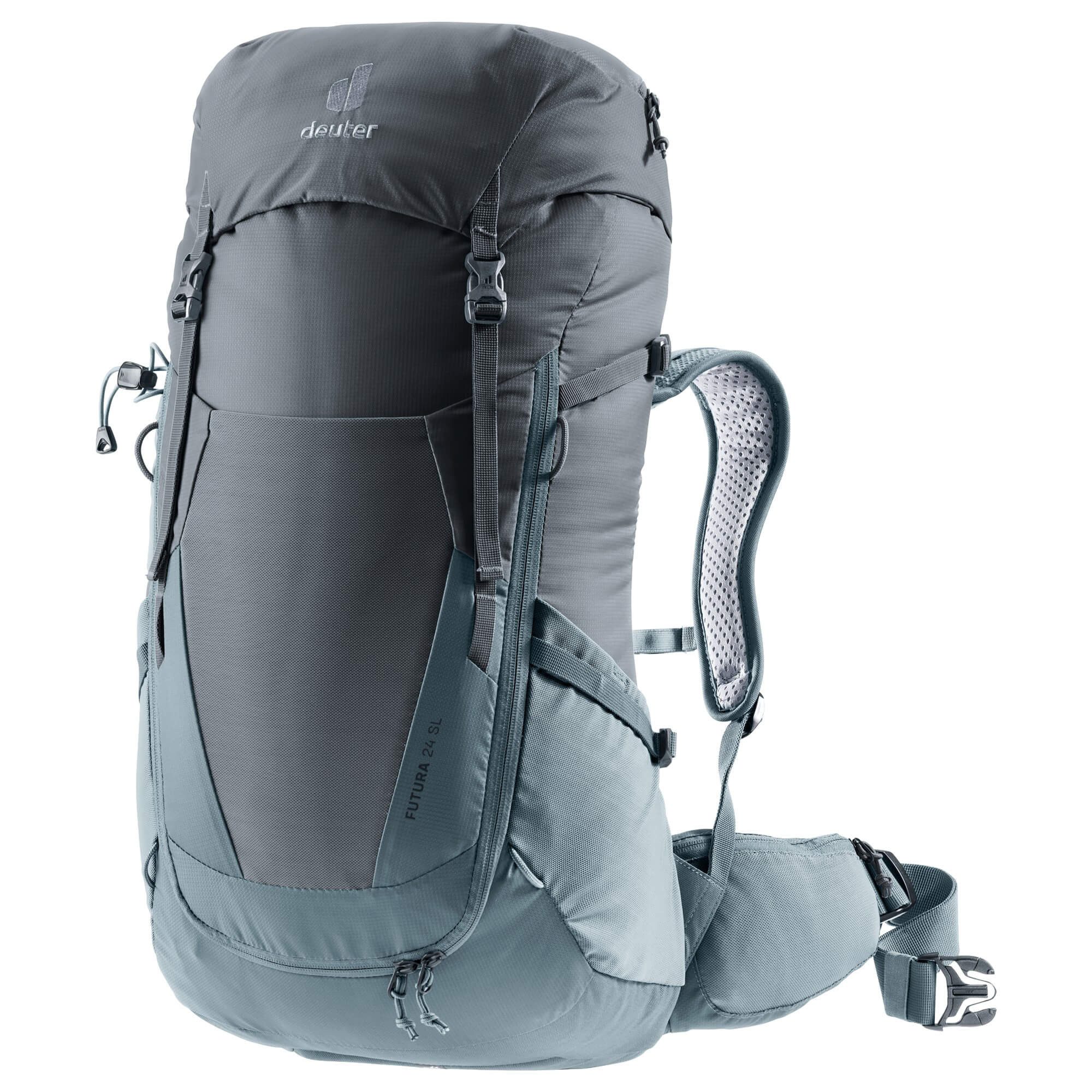 Komfortabel durchs Gelände: Dieser leichte und funktionelle Toploader für Frauen ist perfekt für längere Tageswanderungen, Bergtouren oder Klettersteige. Das neue ergonomische Aircomfort Sensic Netzrücken System macht den Futura leicht. Es schmiegt sich mit seiner neuen Passform komfortabel dem Rücken an und sorgt für maximale Rückenbelüftung. Dieses Modell ist als SL-Version verfügbar. Das frauenspezifische der SL-Rückenlänge zeigt sich bereits bei der Rückenlänge: Frauen haben im Durchschnitt einen nicht ganz so langen Rücken wie Männer. Das Tragesystem der SL-Modelle ist deshalb etwas kürzer angelegt als bei den Deuter Standard-Rucksäcken. Zudem ist das Tragesystem speziell an die weibliche Anatomie angepasst. Leistungsstarke Materialien mit PFC-freier schmutz- und wasserabweisender Impräginierung. Deuter Trinksystem kompatibel. Stretch-Innenfach und elastische Frontstecktasche. Stufenlos verstellbarer Brustgurt. Wanderstockhalterung und Schlaufen für Helmhalterung. Maße: 58 x 30 x 20 cm. Volumen: 24L. Gewicht: 1400g. Material: 60% Polyamid, 40% Polyester.