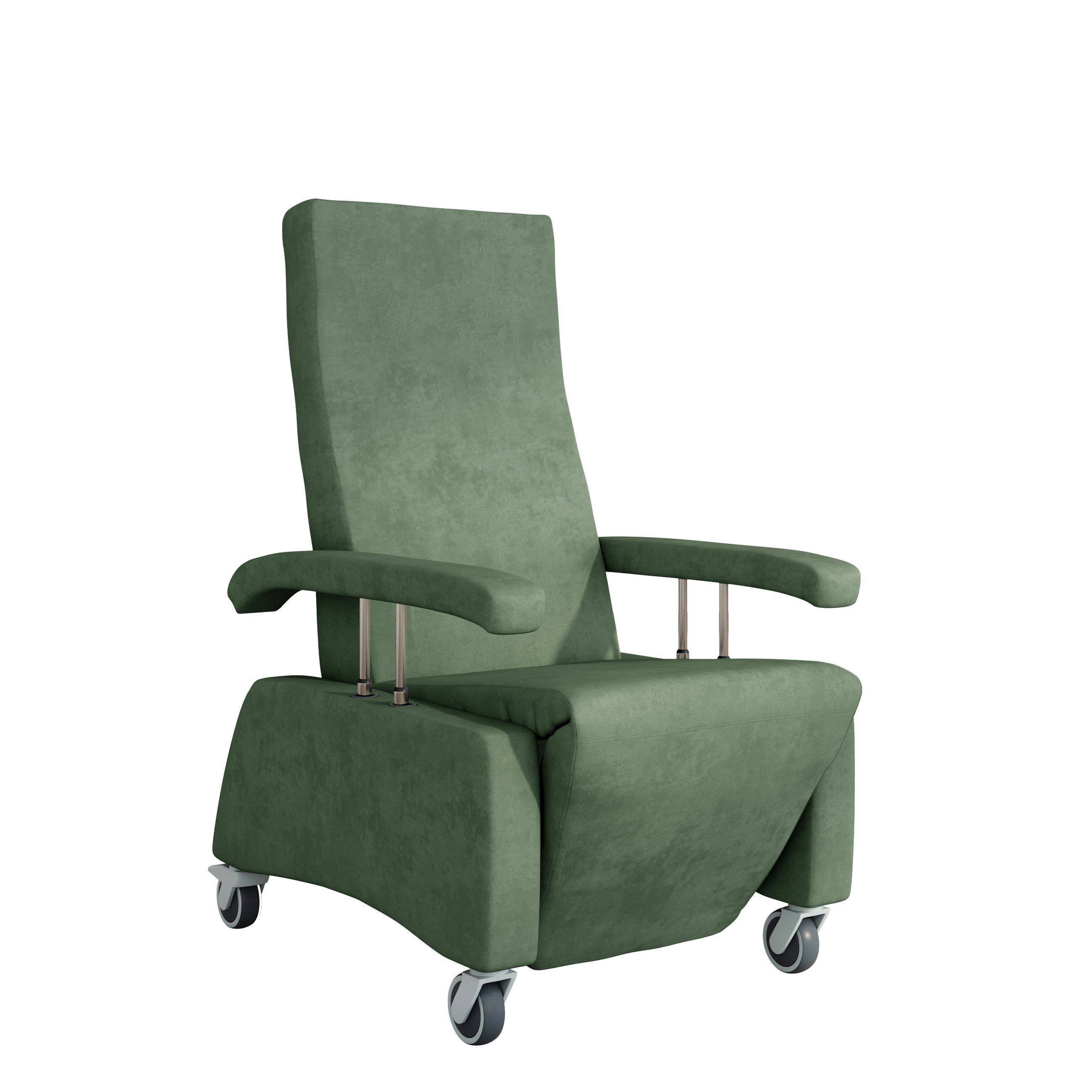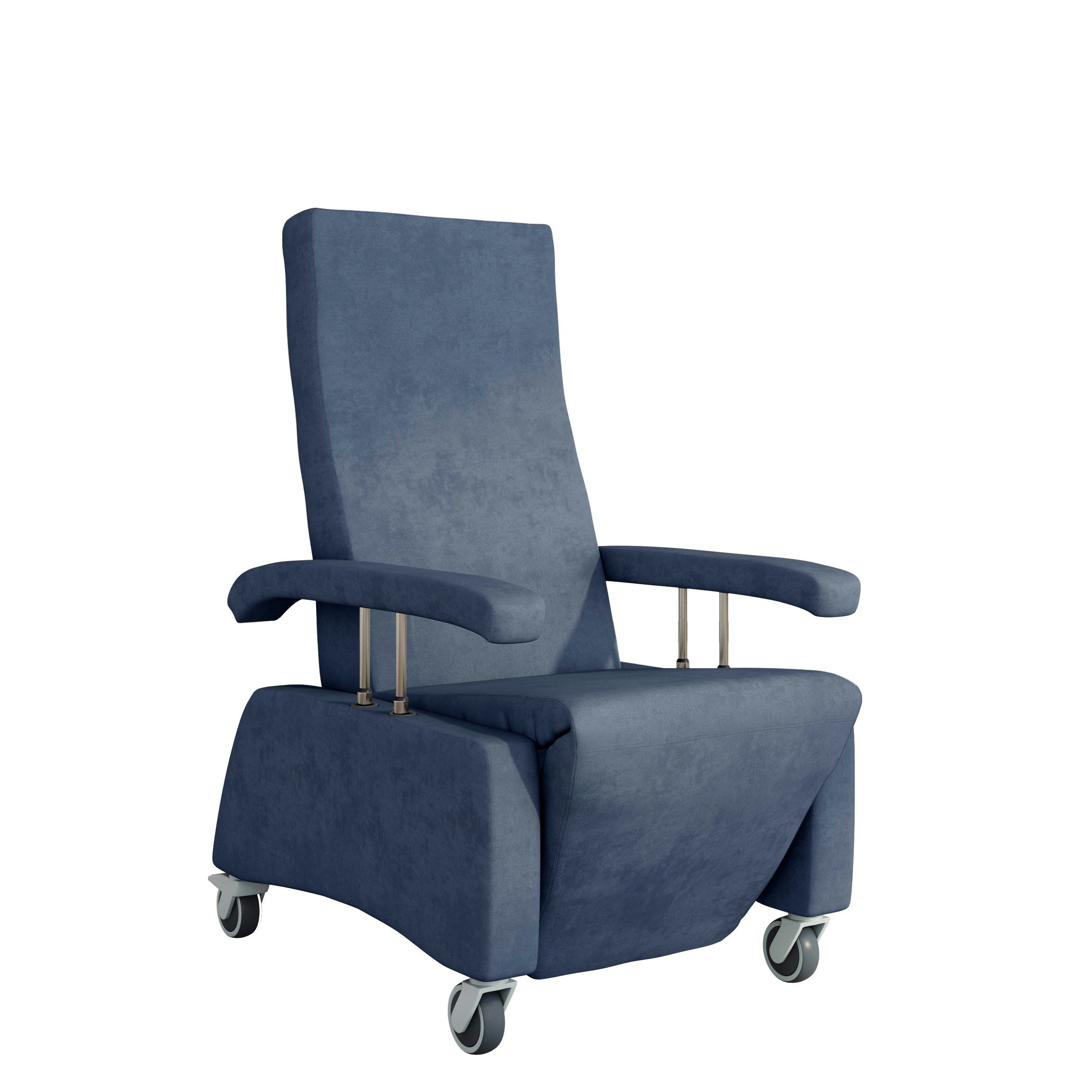 Die versenkbaren Armlehnen (3 Stufen) ermöglichen ein leichtes Umsetzen vom Sessel zu einem Rollstuhl oder zum Pflegebett. Große, stabile Rollen sowie der Schiebegriff sorgen für Mobilität im Pflegealltag. Die hochwertigen Kunststoffrollen lassen sich bequem schieben und eignen sich auch für hochwertige Parkett-Böden. Der Pflegesessel ist bis zu einem Personengewicht von maximal 120 kg konstruiert.