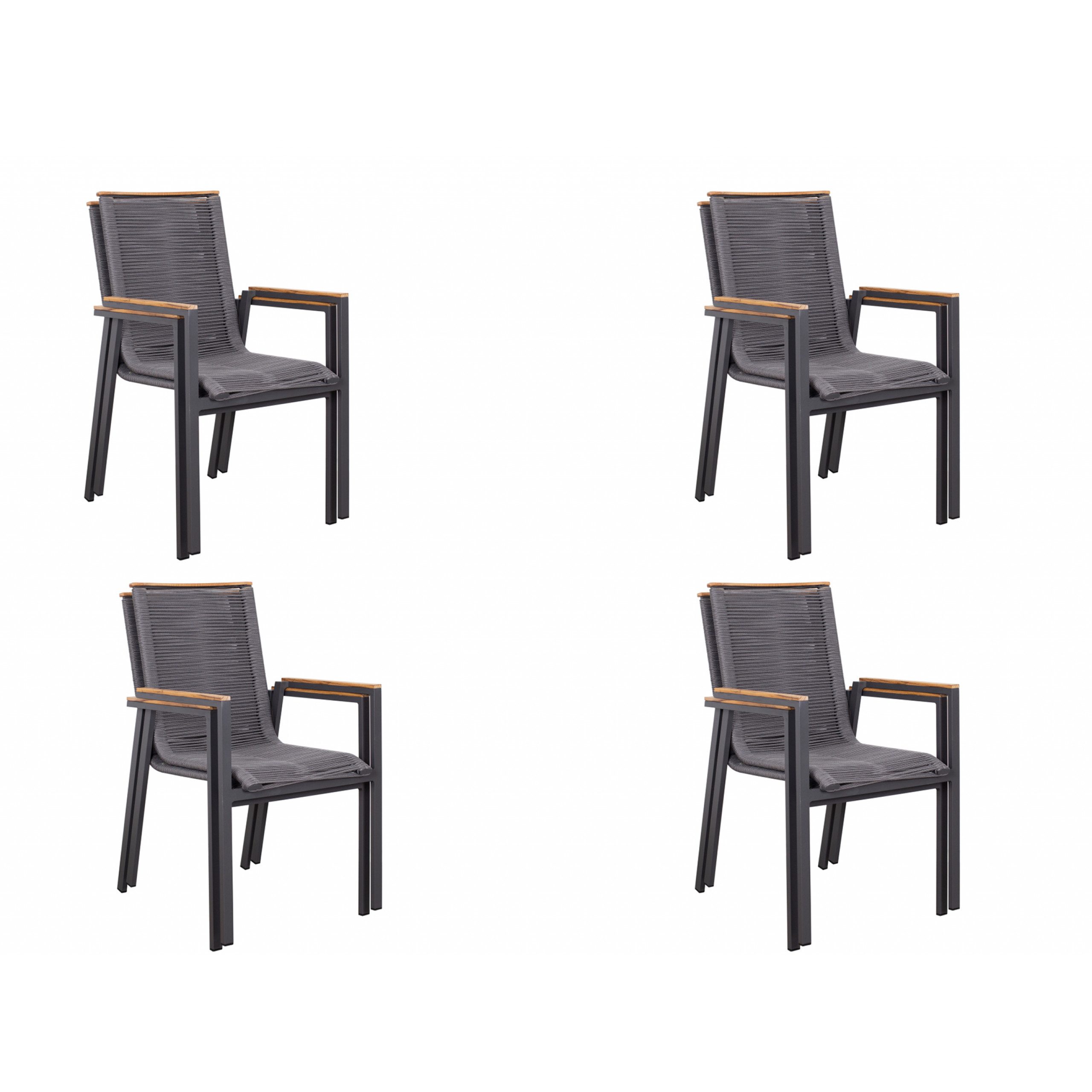 4x deVries Stapelsessel \"MONTANA\" Aluminiumrahmen anthrazit pulverbeschichtet Sitz- und Rückenfläche in Rope grau, Arm- und Rückenlehen mit Teak-Applikationen, Größe: ca. 55x66x87 cm