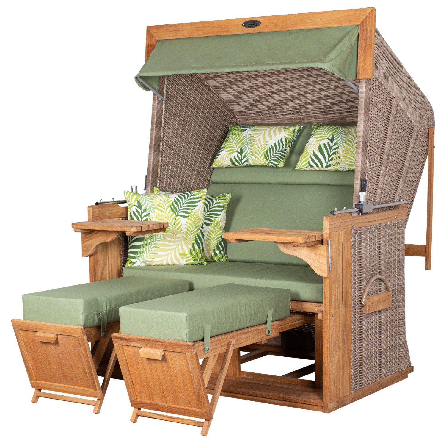 Komfort für Ihre Wellness-OaseDie Bezüge des deVries Nordsee-Strandkorbes sind aus Polyester gefertigt und für den Außeneinsatz hervorragend geeignet. Die uni-grüne Polsterung wird gekonnt durch die Kissen im floralen Druck in Szene gesetzt. Die ebenfalls grüne Sonnenmarkise wird mit der Teakholz-Zierblende zum Hingucker. Die eingearbeitete Windschutzfolie sorgt auch in den Abendstunden dafür, dass störende Zugluft Ihre Entspannung nicht trübt.