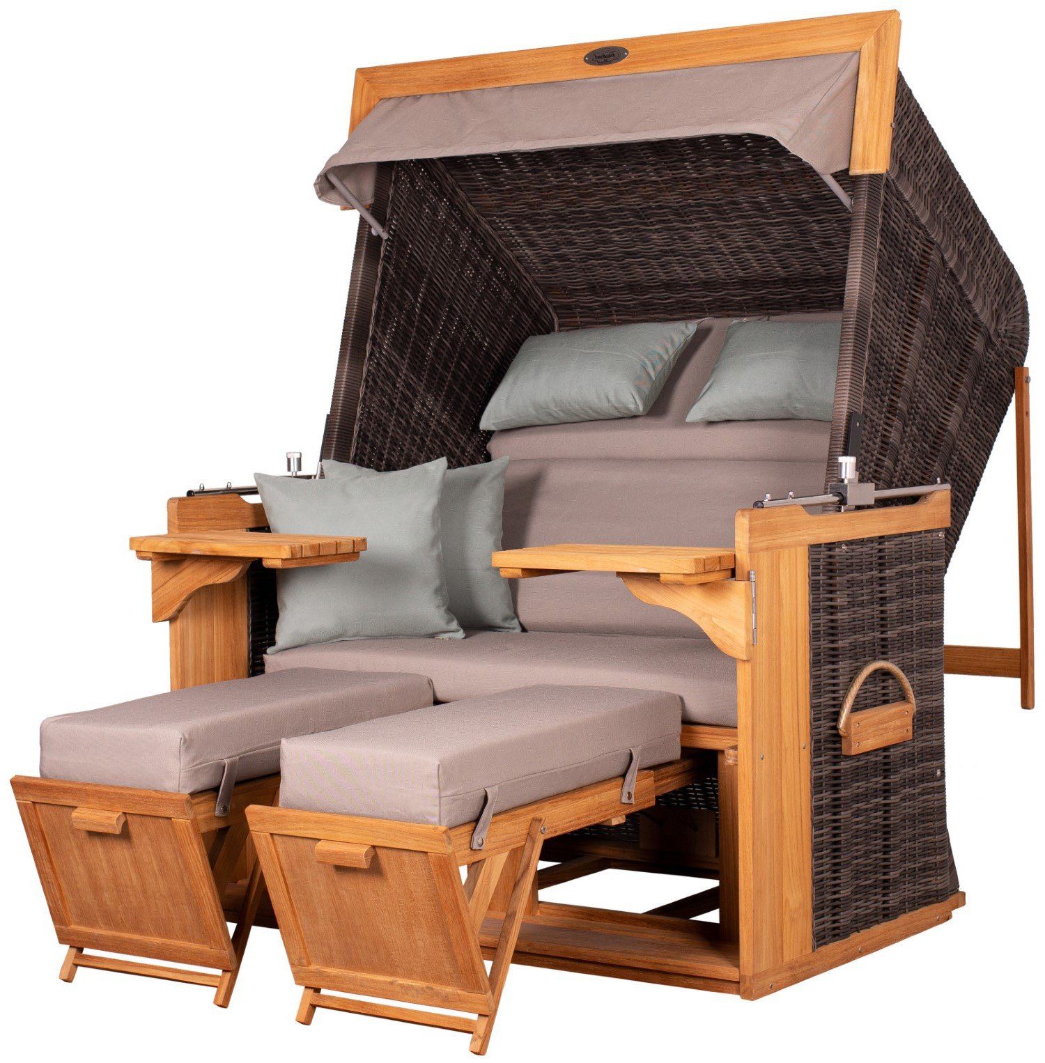 Die Bezüge des deVries Nordsee-Strandkorbes sind aus Olefin (Polypropylen) gefertigt und für den Außeneinsatz hervorragend geeignet. Die uni-graue Polsterung wird gekonnt durch die hellblauen Kissen in Szene gesetzt. Die ebenfalls graue Sonnenmarkise wird mit der Teakholz-Zierblende zum Hingucker. Die eingearbeitete Windschutzfolie sorgt auch in den Abendstunden dafür, dass störende Zugluft Ihre Entspannung nicht trübt.