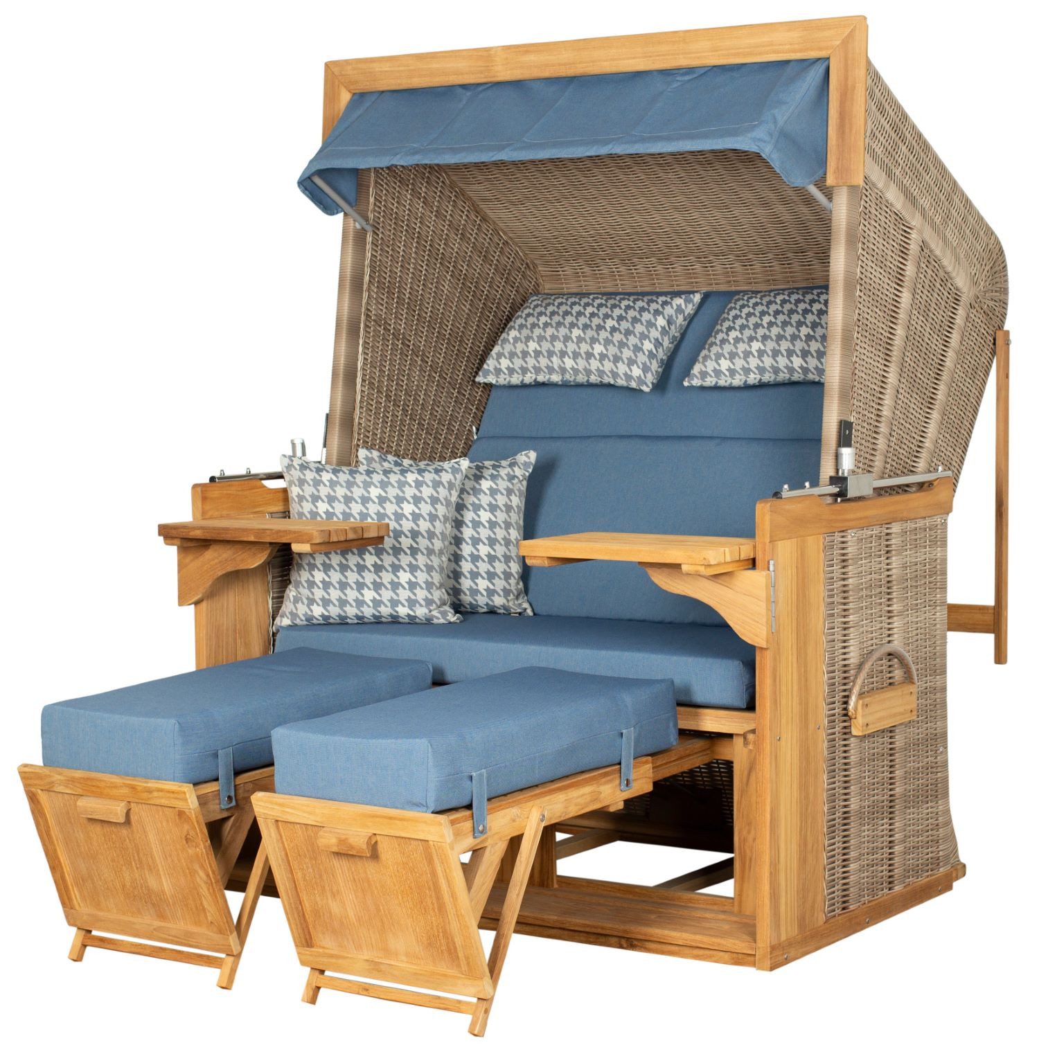 Die Bezüge des deVries Nordsee-Strandkorbes sind aus Olefin gefertigt und für den Außeneinsatz hervorragend geeignet. Die blaue Polsterung wird gekonnt durch die karierten Kissen in Szene gesetzt. Die ebenfalls unifarbende Sonnenmarkise wird mit der Teakholz-Zierblende zum Hingucker. Die eingearbeitete Windschutzfolie sorgt auch in den Abendstunden dafür, dass störende Zugluft Ihre Entspannung nicht trübt.