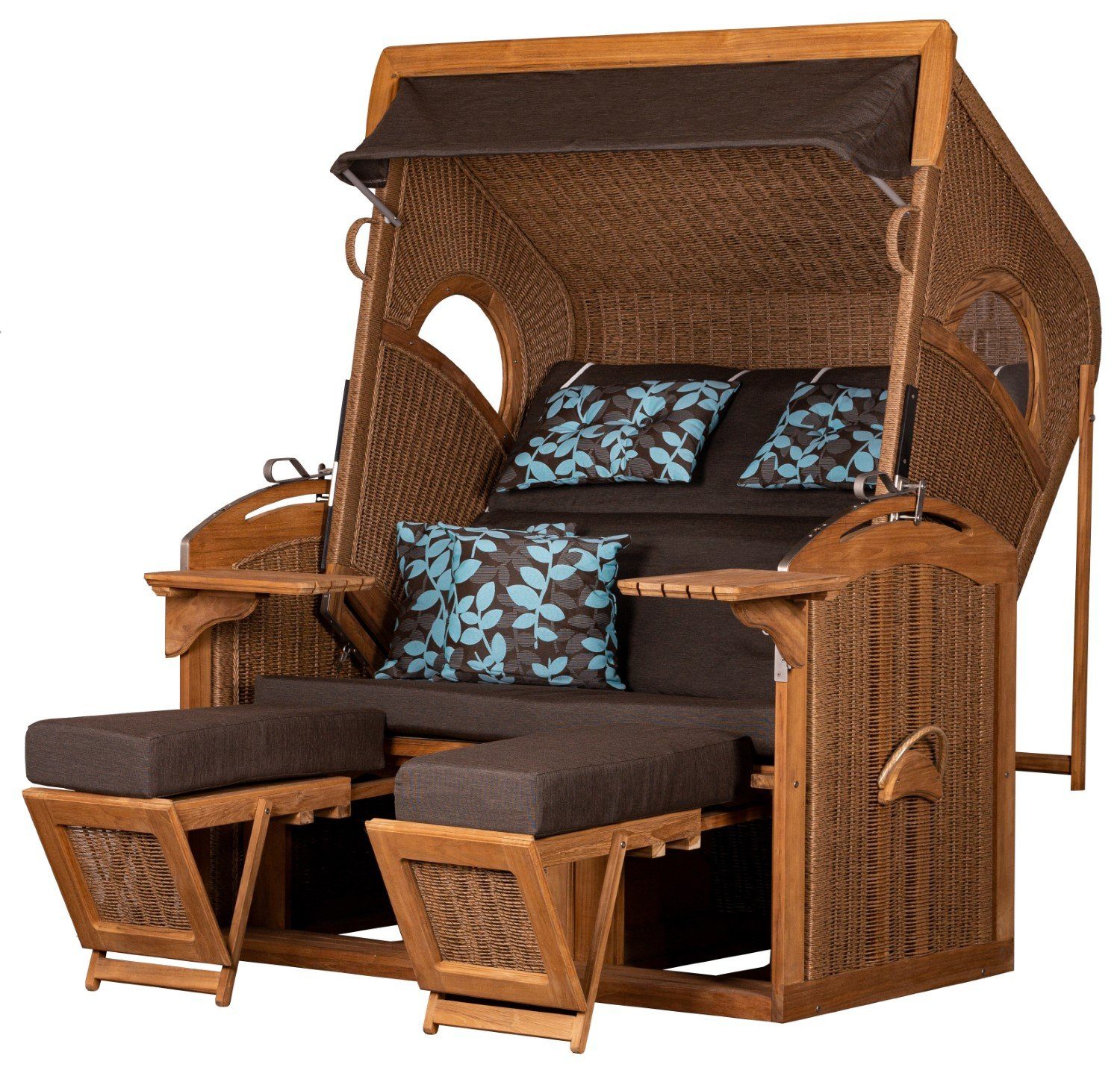 BxTxH: 145x85x180 cm, Dreiviertellieger, Ostsee-Strandkorb, edles Teakholz - spezielle Bullaugen - inkl. Schutzhülle