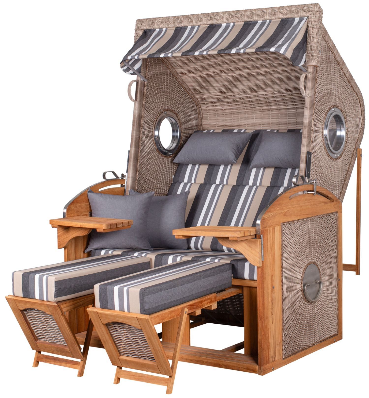 Der Strandkorb Sailor XL bietet ausreichend Platz für zwei Personen und verfügt über einen mehrfach verstellbaren Oberkorb und zwei weich gepolsterte Fußstützen, um Ihren Komfort zu maximieren. Mit den beiden großen Schwenktischen haben Sie immer einen kleinen Snack oder ein kühles Getränk in Reichweite.