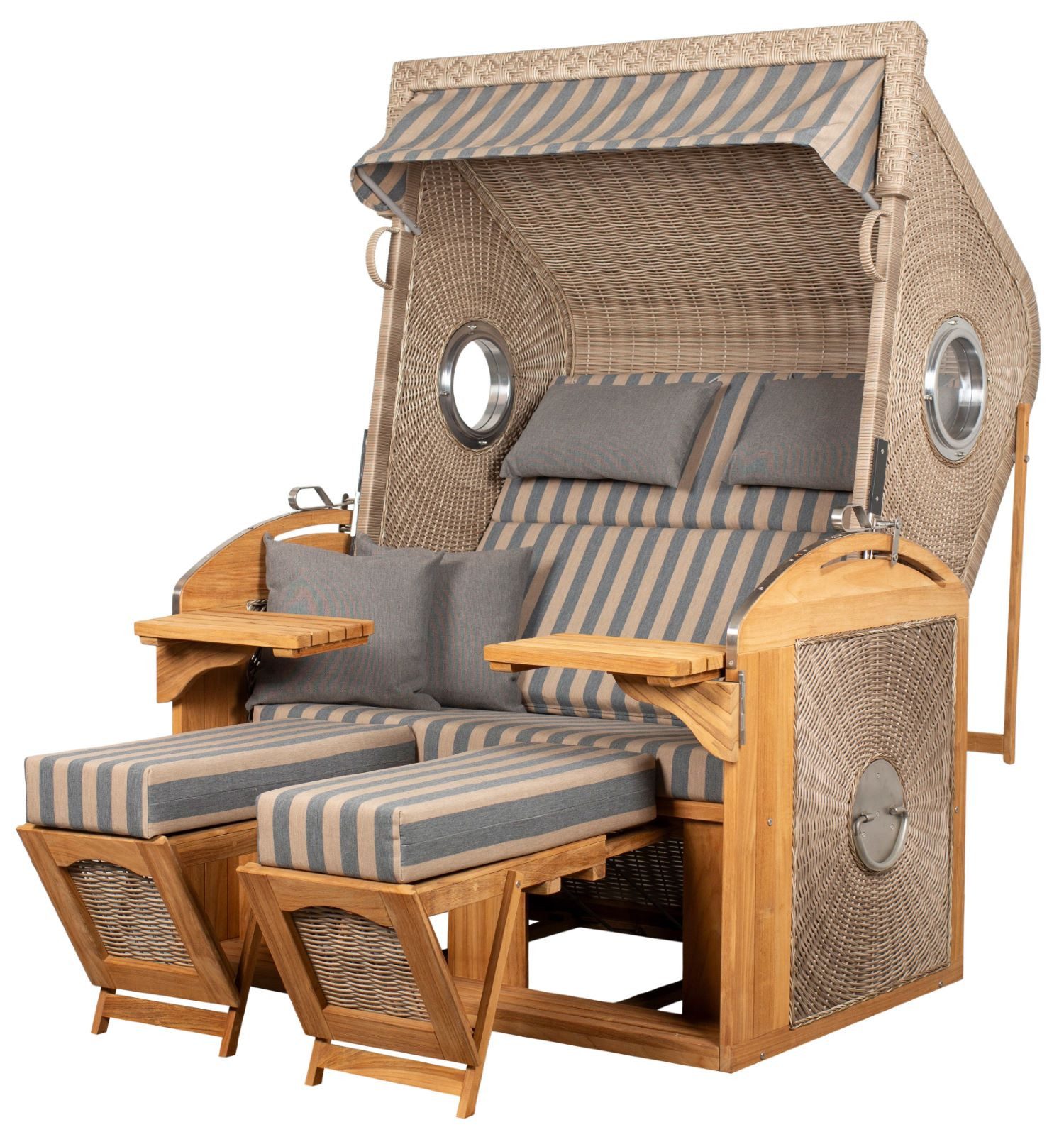 Der Strandkorb Sailor XL bietet ausreichend Platz für zwei Personen und verfügt über einen mehrfach verstellbaren Oberkorb und zwei weich gepolsterte Fußstützen, um Ihren Komfort zu maximieren. Mit den beiden großen Schwenktischen haben Sie immer einen kleinen Snack oder ein kühles Getränk in Reichweite.