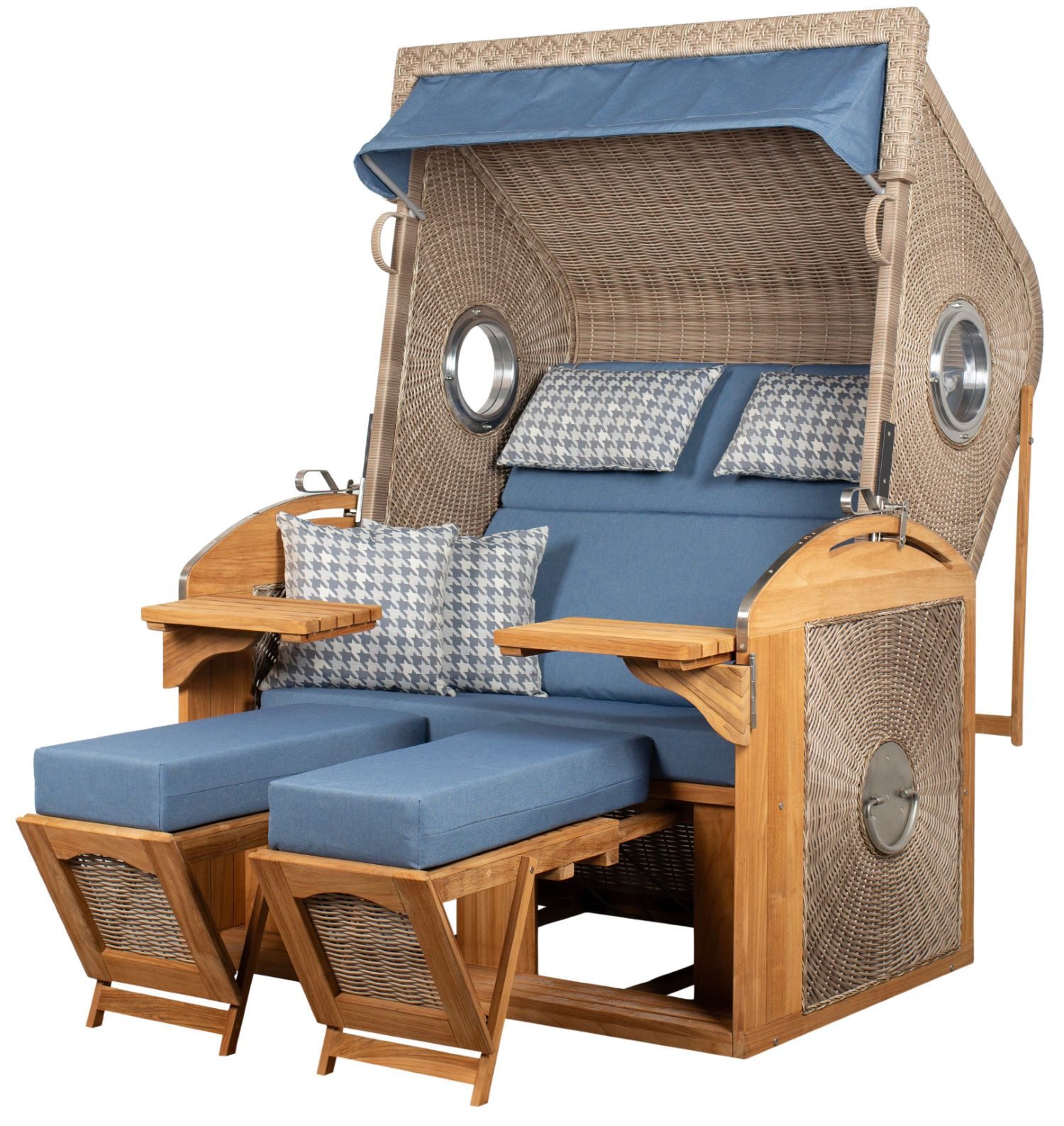 Der Strandkorb Sailor XL bietet ausreichend Platz für zwei Personen und verfügt über einen mehrfach verstellbaren Oberkorb und zwei weich gepolsterte Fußstützen, um Ihren Komfort zu maximieren. Die hellblaue Polsterung wird gekonnt durch die hell- und dunkelblauen Kissen als Wechselbezug in Szene gesetzt. Zwei großzügige Schwenktische sorgen dafür, dass ein Getränk oder ein kleiner Snack jederzeit griffbereit ist.