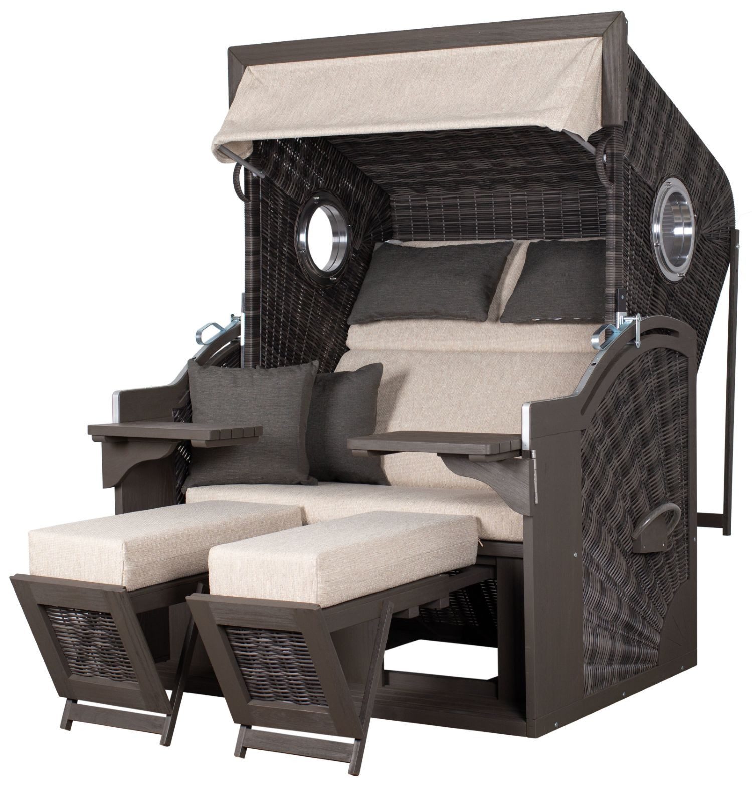 Der Strandkorb PURE Seaside XL von deVries ist die perfekte Oase der Entspannung und vereint modernes Design mit optimalem Komfort. Mit seiner eleganten Farbe in dunkelgrauem Geflecht, fügt sich dieser Strandkorb harmonisch in jede Umgebung ein und verleiht Ihrem Garten oder Ihrer Terrasse eine exklusive Note.