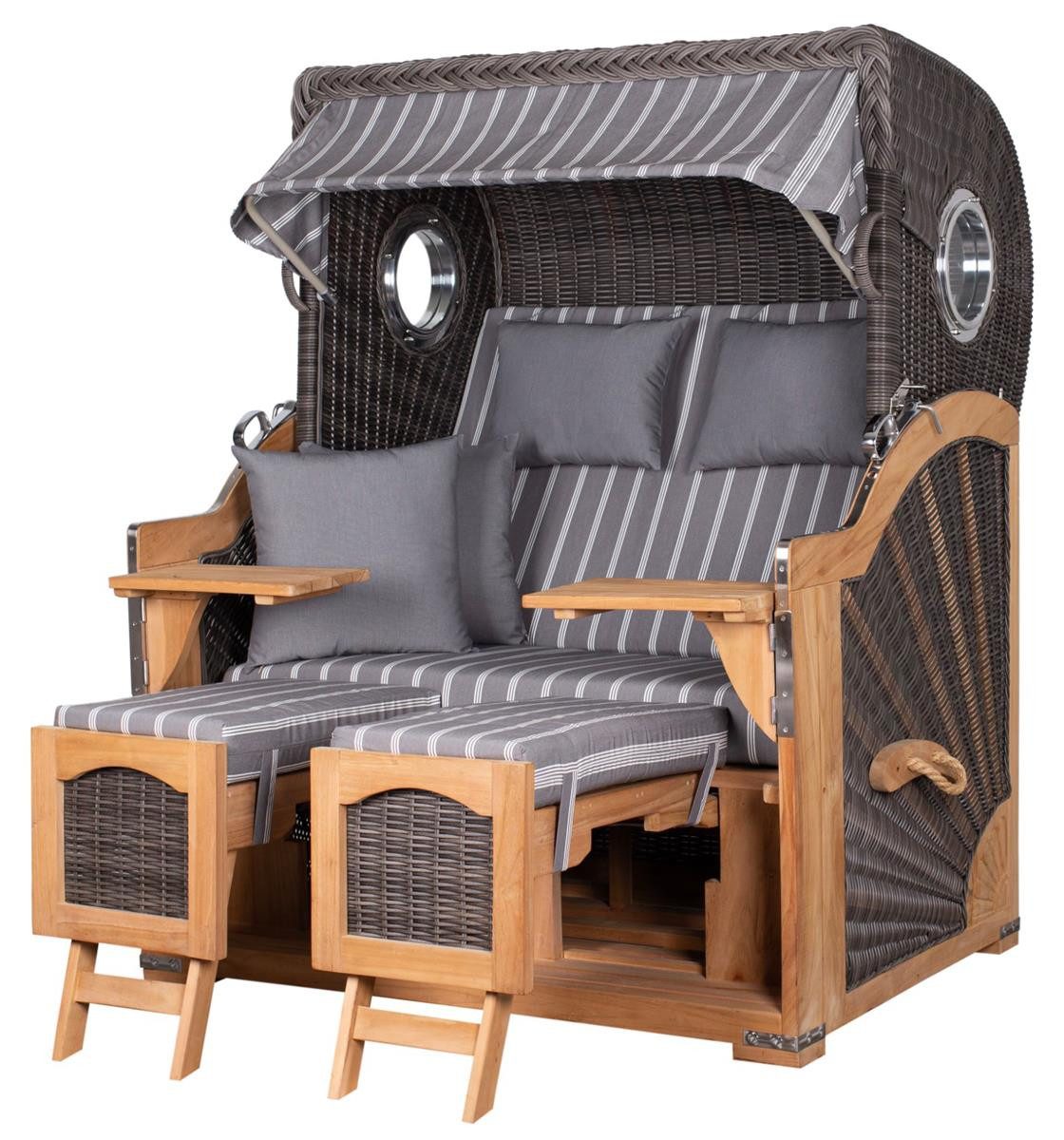Das Wichtigste auf einen BlickLehnen Sie sich im Strandkorb Seemöwe XL zurück und genießen den herrlichen Komfort von Teakholz und witterungsbeständigem PE-Geflecht und erfreuen Sie sich an der wichen Polsterung. Mit der mitgelieferten Schutzhaube schützen Sie Ihren neuen Strandkorb optimal gegen Wind und Wetter.