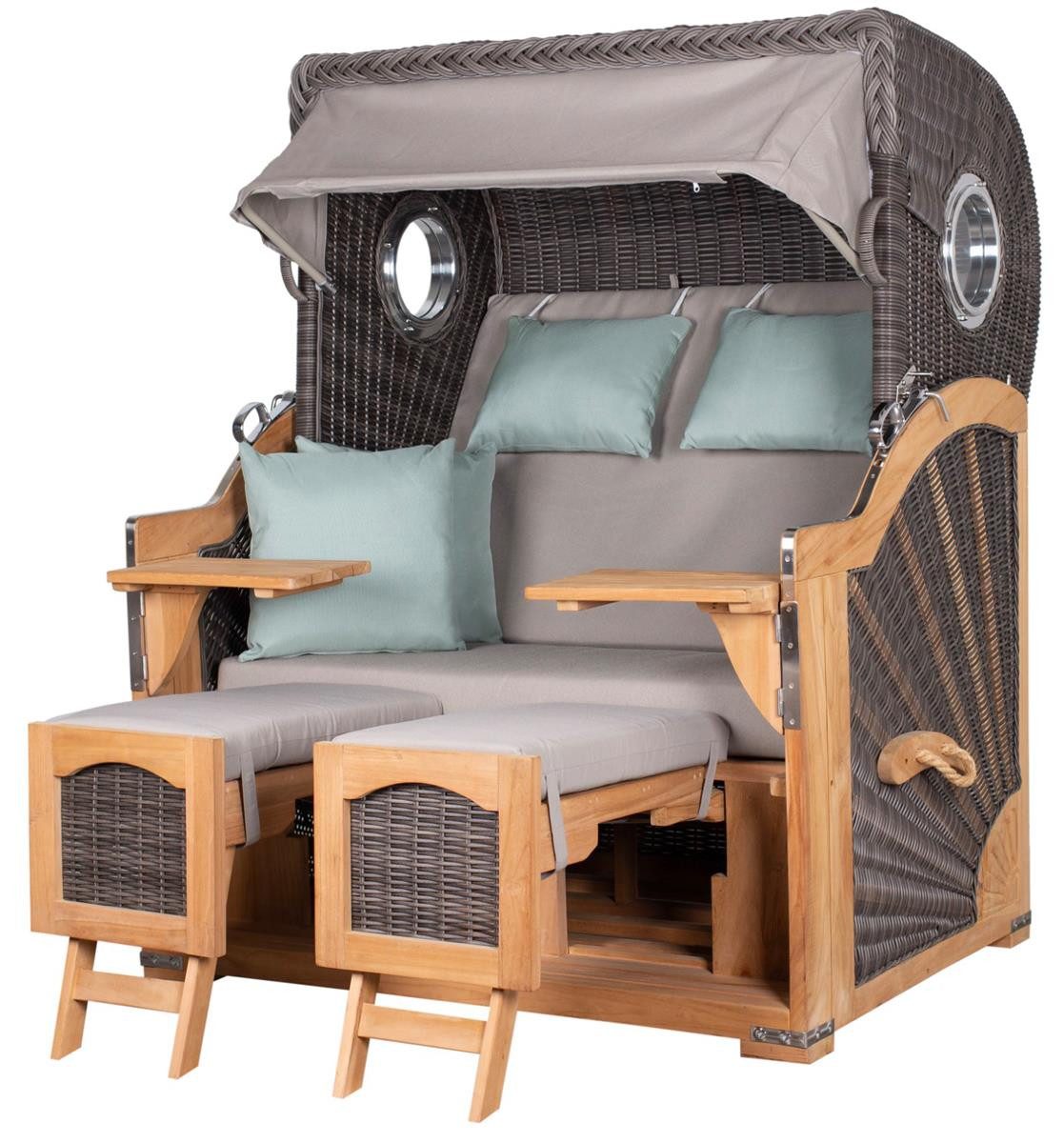 Als Familien-Strandkorb eignet sich der Seemöwe XL sowohl für den Garten als auch auf dem Balkon oder einer Terrasse. Der deVries PURE® Strandkorb wird aus hellem Teakholz gefertigt und hat einen verstellbaren Oberkorb, welcher außen und innen von wetterfestem PE-Geflecht in der Farbe stone grey umgeben ist. In das Geflecht ist eine transparente Schutzfolie integriert.