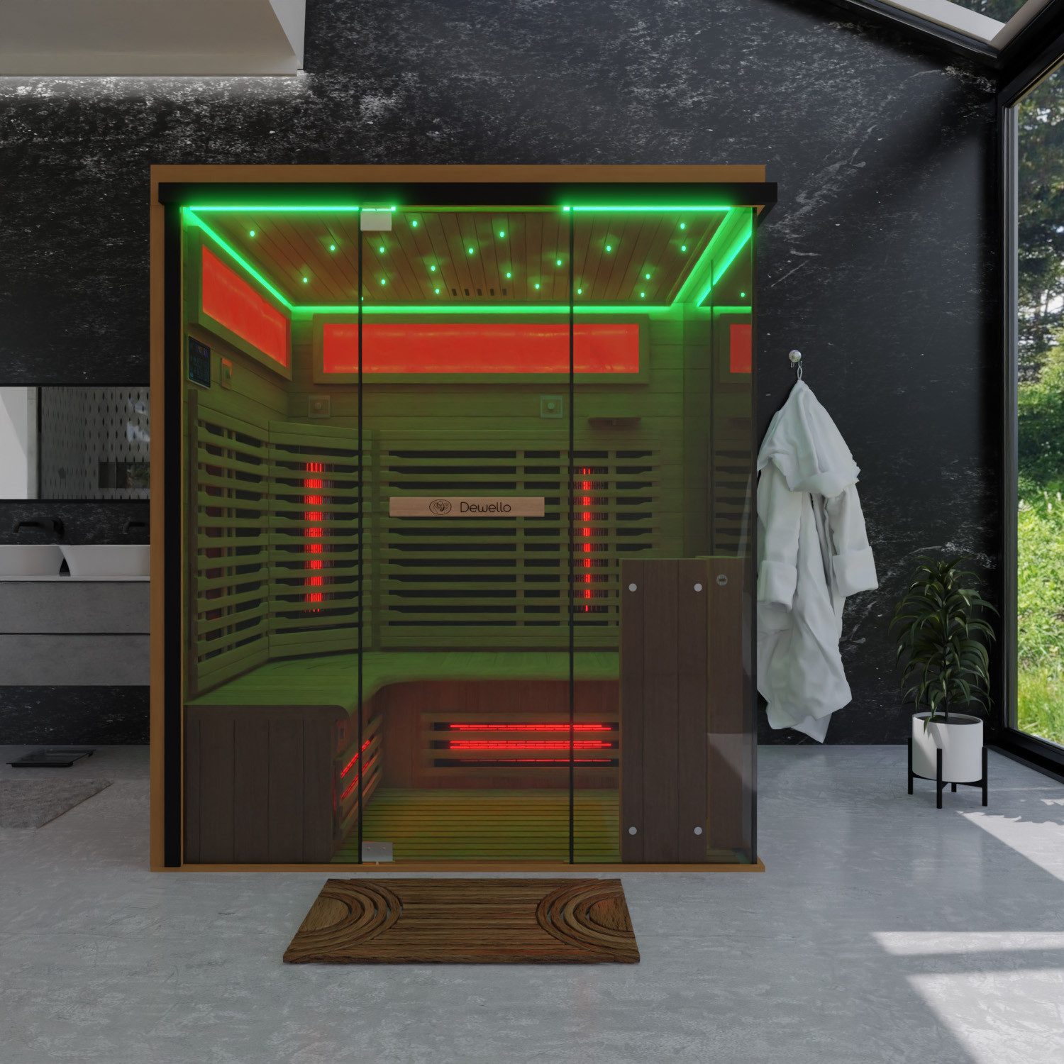 Unsere Infrarotkabine beeindruckt nicht nur mit ihrer herausragenden Funktionalität, sondern auch durch ihr ansprechendes Design und die hochwertige Verarbeitung. Sie passt sich nahtlos in jedes Wohnambiente ein, egal ob im Badezimmer, im Fitnessbereich oder im Schlafzimmer.