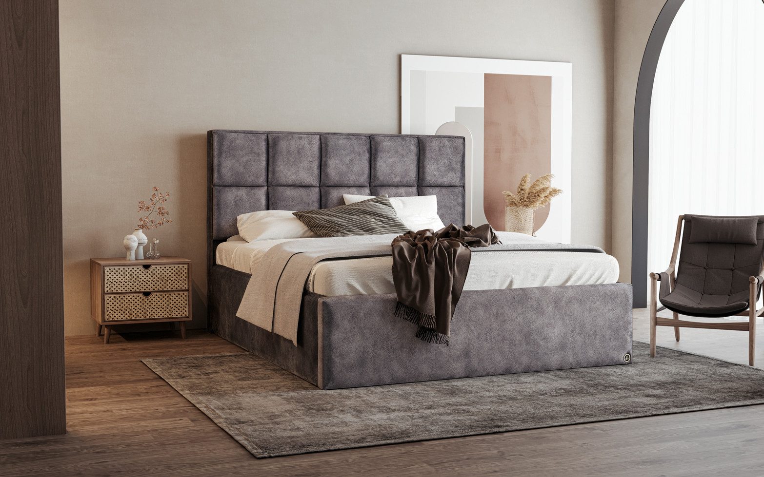 Mit seinem eleganten Design und den drei verschiedenen Farboptionen - beige, hellgrau und dunkelgrau - fügt sich das Polsterbett Vienna nahtlos in jedes Schlafzimmer ein und verleiht ihm eine zeitlose Eleganz.