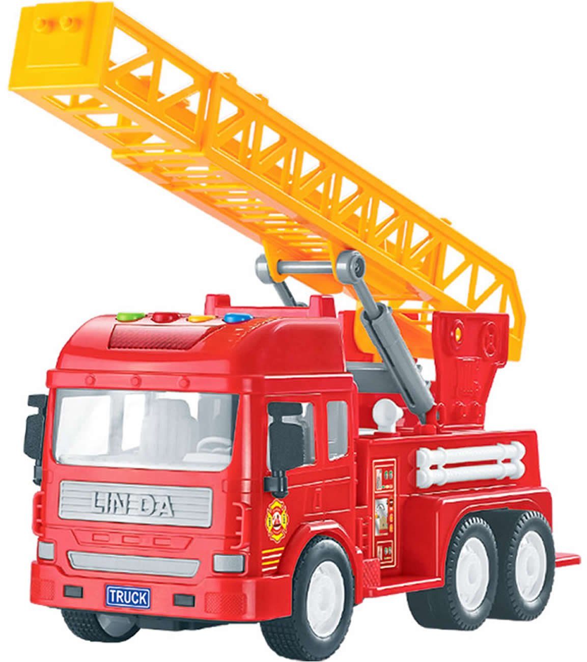 112 – Feuerwehr, bitte schnell kommen!!! Ein echtes Spielvergnügen bietet diese Drehleiter mit Licht- und vielen verschiedenen Soundeffekten. Mit diesem Einsatzfahrzeug, ausgestattet mit einem 360 Grad drehbaren Drehkranz inkl. beweglichem Teleskop-Leiterpark, geht es blitzschnell zum Einsatzort. Diese moderne Drehleiter ist reibungsbetrieben (Fahrzeug mehrmals nach vorne schieben, loslassen und schon fährt es los) und benötigt daher keine Batterien. Na dann, nichts wie los...der nächste Einsatz wartet schon!