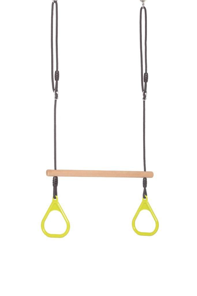 Das hölzerne Ringtrapez mit grünfarbenen Kunststoffringen ist das ideale, kompatible Zubehör für Ihre BERG PlayBase und bietet stundenlangen akrobatischen Schaukelspaß!