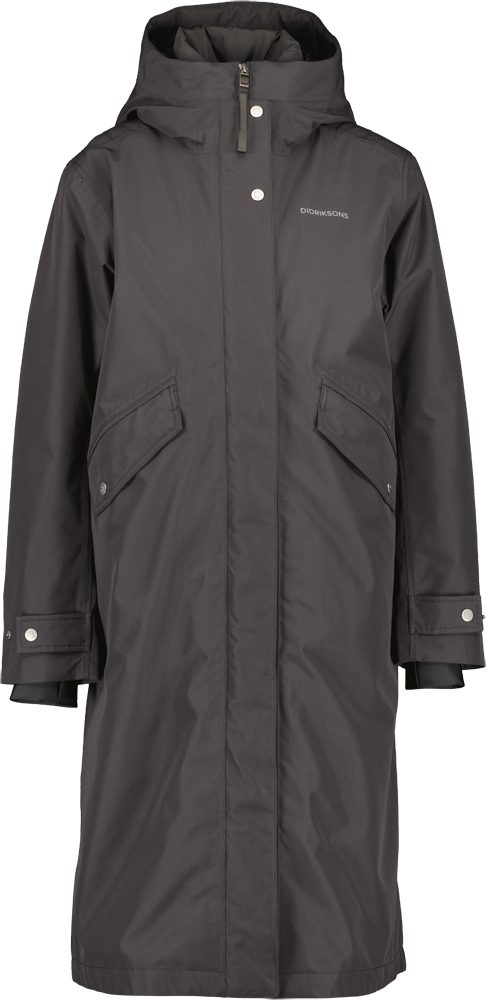 Der Funktionsmantel von Didriksons ist ein Motivationsbooster, mit dem Frauen den inneren Schweinehund ganz leicht besiegen. Er hat eine Knopfleiste sowie eine Kapuze mit farblich passendem Innenfutter. In der Innentasche werden Wertgegenstände auch unterwegs jederzeit parat sein. Der Look wird mit einer Logostickerei aufgelockert. Auch bei nach vorne gebeugter Körperhaltung, bedeckt er den Rücken. So ist er besonders beim Fahrradfahren ein zuverlässiger Begleiter.