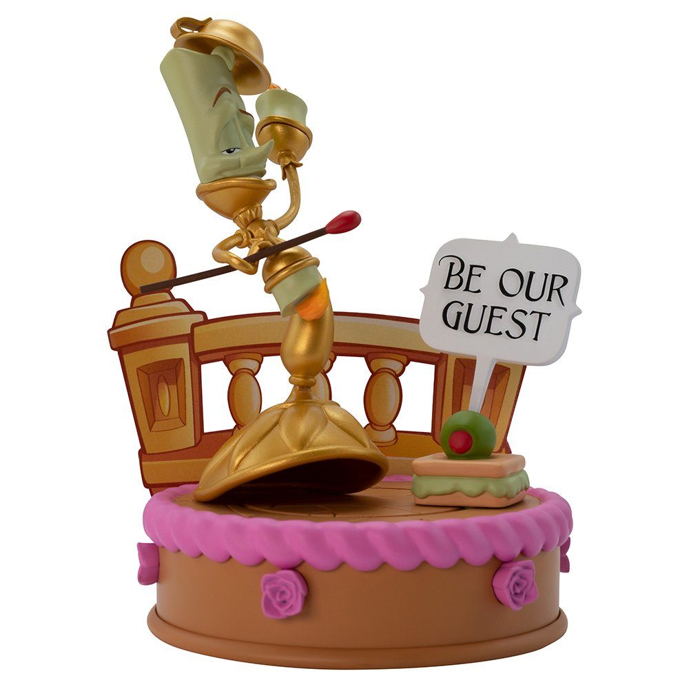 Figur in Form von Lumière mit dem Schild "Be Our Guest".