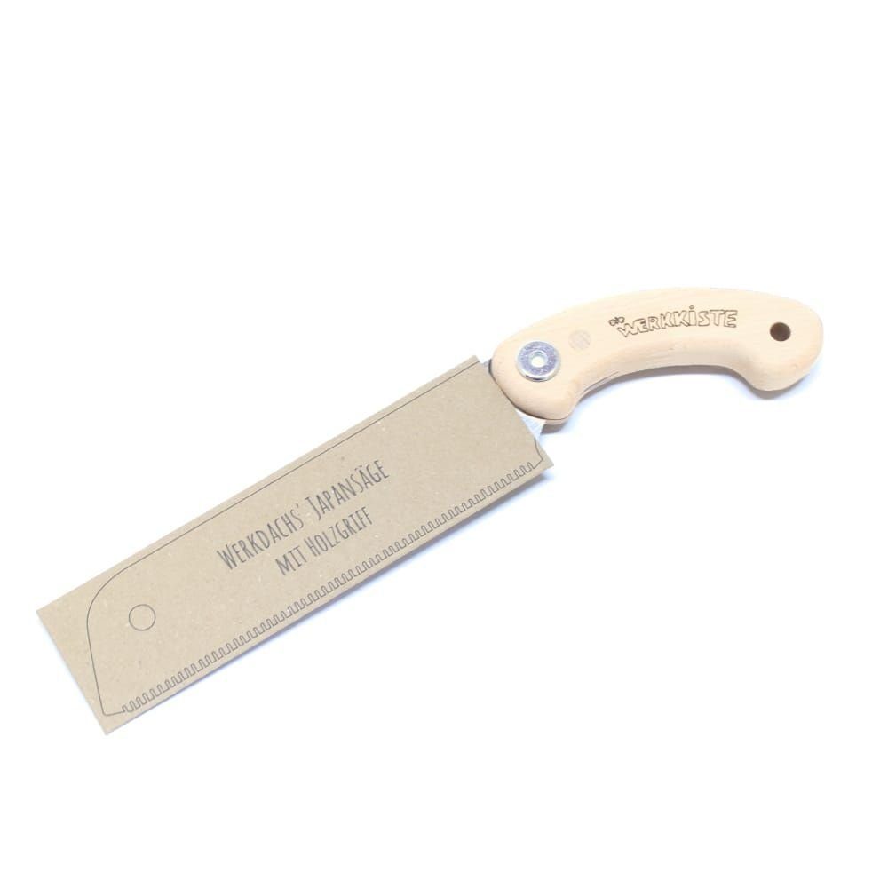 Unsere beliebt Japansäge gibt es nun endlich auch mit Holzgriff. Die Säge ist das wichtigste Werkzeug für Holzarbeiten. Diese Japansäge arbeitet wie alle "Japaner" auf 'Zug', dadurch ist viel weniger Kraft beim Sägen erforderlich und viel feinere, sauberere Schnitte sind möglich. Besonders für Kinder ist das Sägen nach etwas Übung viel einfacher. Durch das rückenlose Sägeblatt können Leisten beliebiger Stärke durchgesägt werden. Unsere Kindersägen werden aus sehr hochwertigem Material gefertigt. In unserer Kurswerkstatt sind die Sägen bereits seit 3 Jahren im Einsatz und halten auch dieser hohen Belastung mühelos stand. Japansägen sollten - wie alle Werkzeuge- gepflegt und gut behandelt werden. Bitte nicht in Metall sägen oder mit der Säge "hämmern". Wir empfehlen den Sägegriff mit etwas Naturöl (Leinöl, etc.) zu behandeln. Dies schütz das Holz vor verfärbungen und Schmutz. Die Säge ist 30 cm lang, das Sägeblatt 17,5 cm. Die Säge besitzt einen gelenkschonenden 'Revolvergriff' der Kindern besonders gut in der Hand liegt. Achtung: Benutzung nur unter Aufsicht von Erwachsenen. Die Säge ist kein Spielzeug und sehr scharf.
