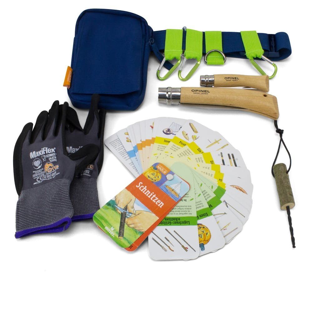 Die kleinen Waldfreunde und Abenteurer*innen sind mit diesem Set perfekt für das Arbeiten und Spielen im Wald ausgerüstet und das von Anfang an. Der Outdoorgürtel mit drei Karabinerhaken und einem Ring lässt sich individuell bestücken mit Messern oder dem Naturbohrer. In der Tasche lassen sich die Grünholzsäge und viele kleine Schätze verstecken. Außerdem bietet der Schnitzfächer tolle Anleitungen und Ideen, was man alles mit Stöckern und Messern schnitzen und bauen kann. Die Opinel Grünholzsäge ist die perfekte Begleitung für dickere und feuchte Äste. Das Opinel Schnitzmesser aus Frankreich hat sich als Klassiker bewährt und ist Ideal für erste Schnitzereien mit Stöckern aus dem Wald. Mit dem Waldkita Starter-Set aus hochwertigen Materialien beginnt die Laufbahn als Waldkitakind spielerisch und sicher.