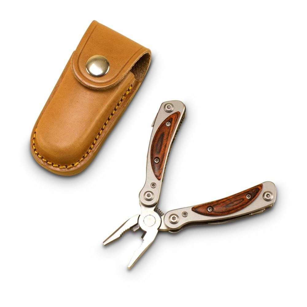 Das Multitool ist mit schönen Holzgriffen versehen und kommt in einer praktischen Ledertasche mit Gürtelschlaufe.