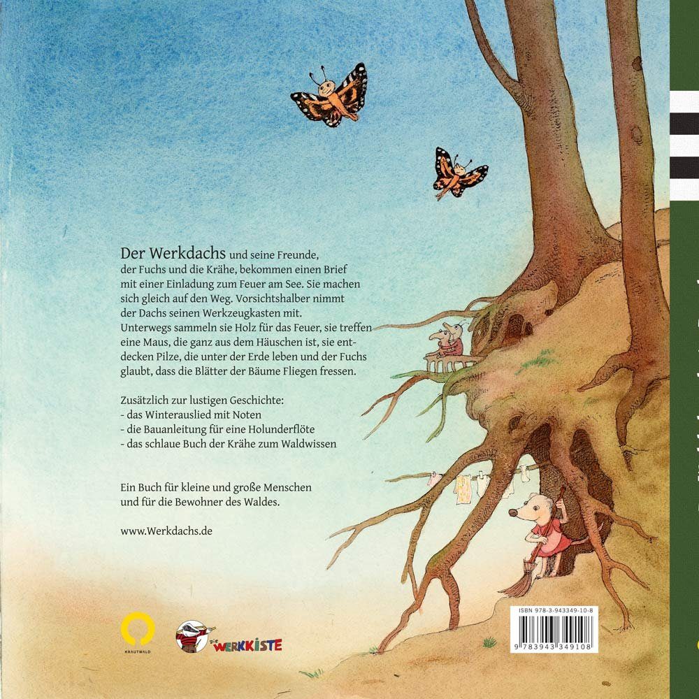 Der Werkdachs und seine Freunde, der Fuchs und die Krähe, bekommen einen Brief mit einer Einladung zum Feuer am See. Sie machen sich gleich auf den Weg. Vorsichtshalber nimmt der Dachs seinen Werkzeugkasten mit.