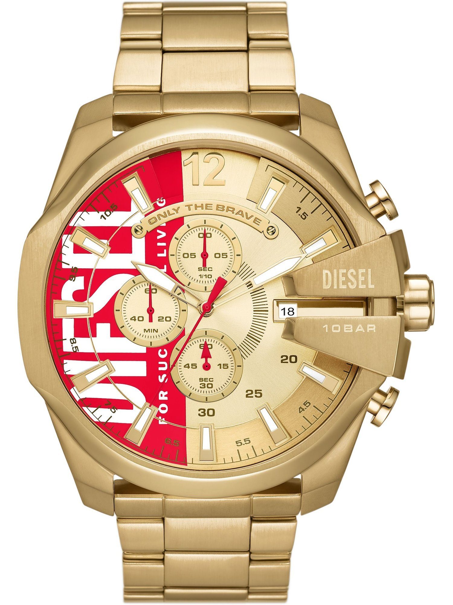 Diesel Uhren stehen für Selbstbewusstsein und Innovation. Mit ihren unverwechselbaren Designs und robusten Materialien sind sie perfekt für alle, die sich nicht anpassen wollen und auf außergewöhnliche, coole Looks setzen. Die Diesel Mega Chief ist ein sportiver Chronograph für Männer, die bei Stil und Qualität keine Kompromisse machen wollen. Das Edelstahlgehäuse und das Edelstahlband bieten einen sportlichen Look vom Office bis in die Freizeit. Sowohl das Gehäuse als auch das Armband der Diesel Mega Chief kommen in Gold daher, wozu das goldene Ziffernblatt harmonische Akzente setzt. Die Farbgebung komplett in Gold lässt die Diesel Mega Chief im angesagten Monochrome Look erstrahlen. Das runde Gehäuse strahlt eine hohe Eleganz und Stilsicherheit aus. Über allem liegt ein schützendes Mineralglas. Der Chronograph trägt die typischen Hilfsziffernblätter, die die sportliche Optik unterstreichen. Das goldene Edelstahl-Band verleiht der Uhr einen Hauch von Luxus und die Klappschließe sorgt dafür, dass sie perfekt sitzt. Praktisches Detail: Die Datumsanzeige, die jederzeit das Tagesdatum mit einem Blick verrät. Die Diesel-Uhr besticht nicht nur durch ihr Quarz-Werk, welches für höchste Präzision sorgt, sondern auch durch ihre Funktionalität: Sie ist bis zu 10bar wasserdicht und somit perfekt geeignet für Ausflüge ans Wasser. Diese Uhr von Diesel ist mehr als nur ein Accessoire – sie ist eine durchdachte Wahl für alle, die Wert auf Qualität und Stil legen.
