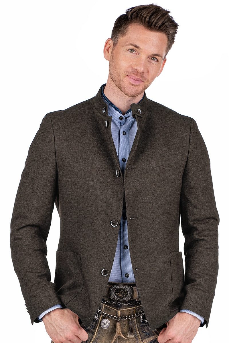 Kernige Männlichkeit trifft auf modernen Stil – dieser Trachtenjanker aus hochwertigem, angenehm weichem Jersey steht für markanten Look und selbstbewusstes Auftreten. Der edle Herrenjanker überzeugt mit moderner Passform im Modern Fit, einer weichen Haptik und höchstem Tragekomfort. Ein Stehkragen mit dekorativen Knöpfen und Riegel aus Jankerstoff unterstreicht den traditionellen Charakter, während eine linke Brusttasche mit breiter Paspel sowie aufgesetzte, leicht abgerundete Taschen vorn für stilvolle Details sorgen. Innen bieten zwei praktische Taschen mit Knopfverschluss zusätzlichen Stauraum. Die Ärmelenden sind mit Zierknöpfen im Kissing Buttons Design veredelt, Seitenschlitze gewährleisten Bewegungsfreiheit und das schwarze Taftfutter trägt sich angenehm. Bitte beachten Sie den Größenzuschlag ab Размер 28, 56 bzw. 110.